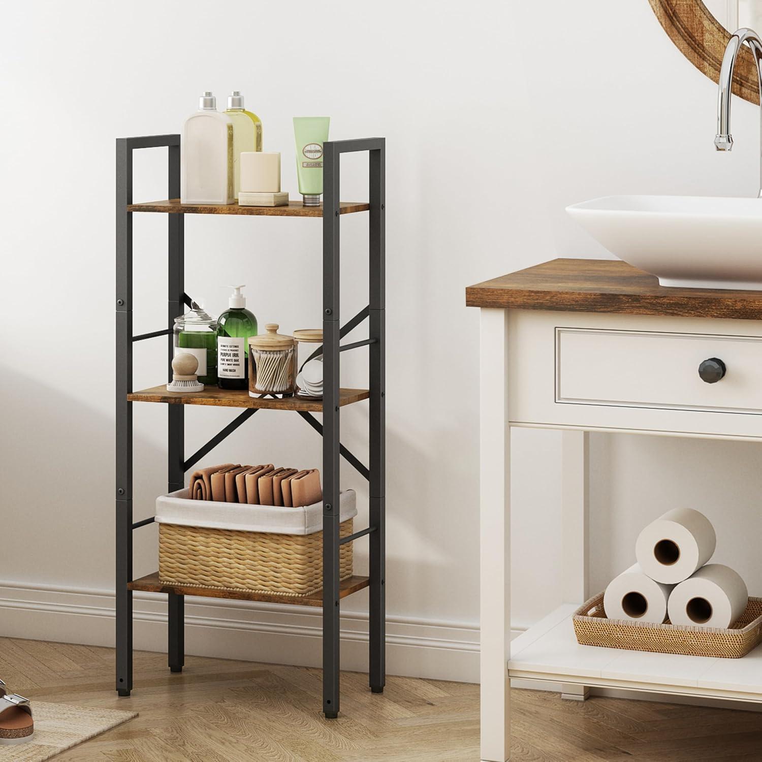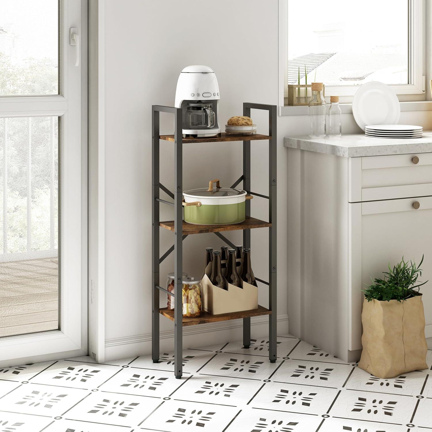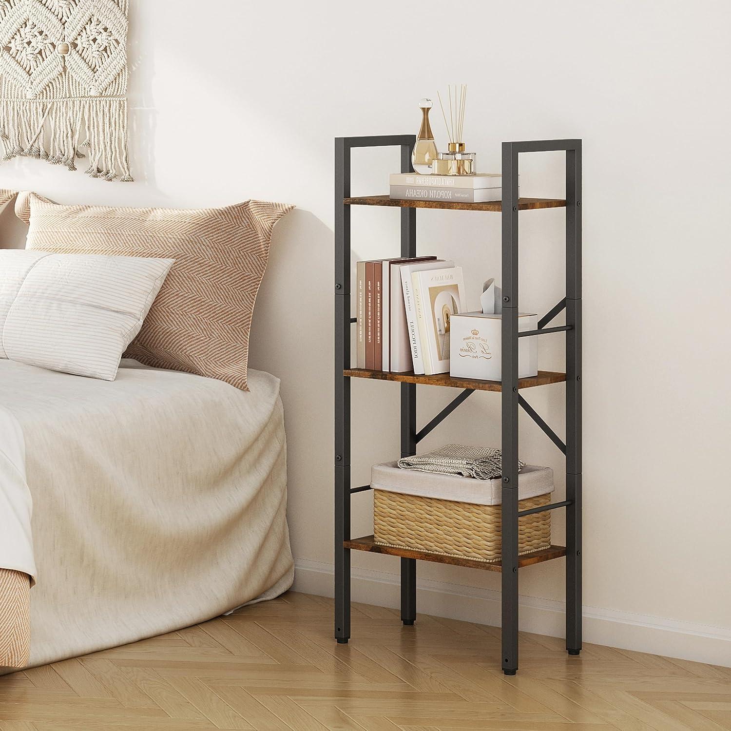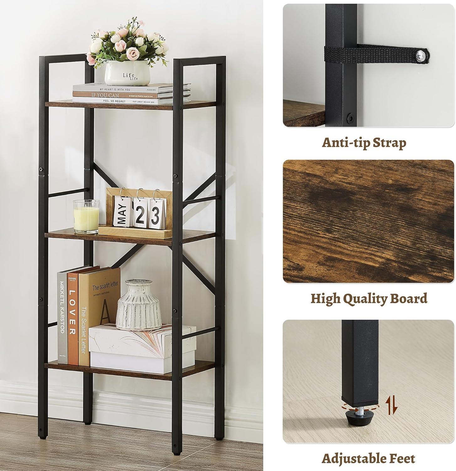 We found the slim, three-tier design perfect for fitting into tight spaces without sacrificing storage capacity. Its narrow footprint of just 16.9″ by 9.4″ allows it to slide effortlessly into corners or beside furniture, while the 39.5″ height and 13″ shelf spacing maximize vertical storage. The sturdy metal frame with X-shaped reinforcements and anti-tip kit provide peace of mind, allowing us to store books, decorative items, and office supplies confidently.Whether placed in the bedroom for displaying plants and books or in the home office as an organizer for files and stationery,it adapts seamlessly. The rustic brown finish complements both vintage and industrial aesthetics, blending beautifully with various décor styles.