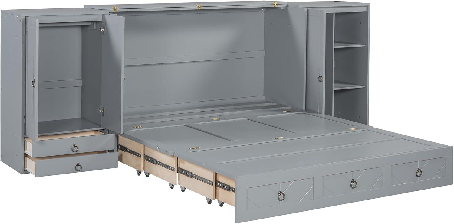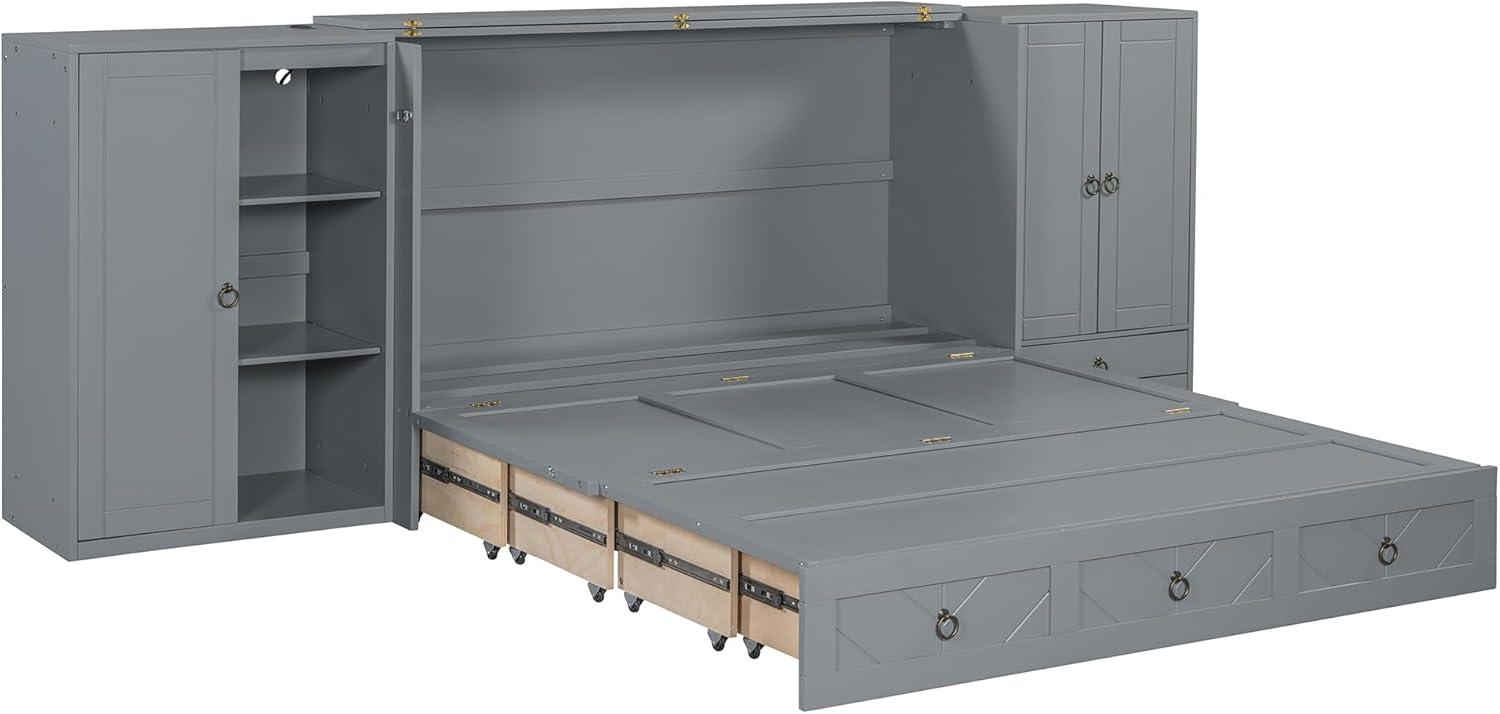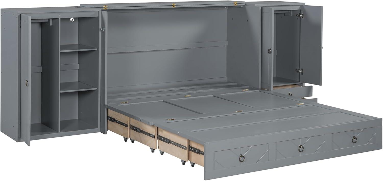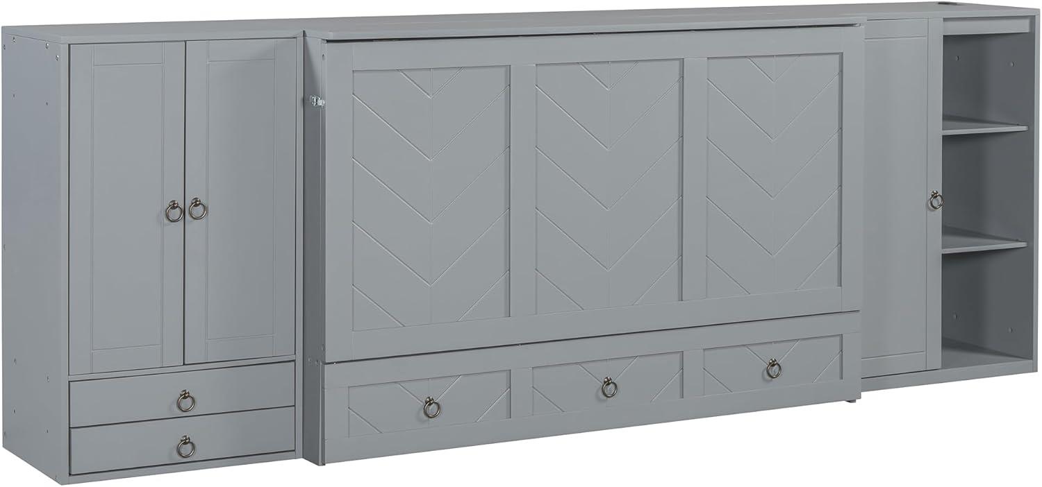 This gray Murphy bed seamlessly blends functionality with style, featuring two versatile cabinets that serve as mini wardrobes with built-in hanging rods for clothing storage. One cabinet smartly incorporates a power outlet alongside three tiered shelves, allowing us to keep our devices charged and essentials organized within arm’s reach. Below the bed, two spacious drawers provide additional storage space, perfect for linens or other items, while the vintage-style handles add a subtle touch of charm that complements a variety of decor styles.