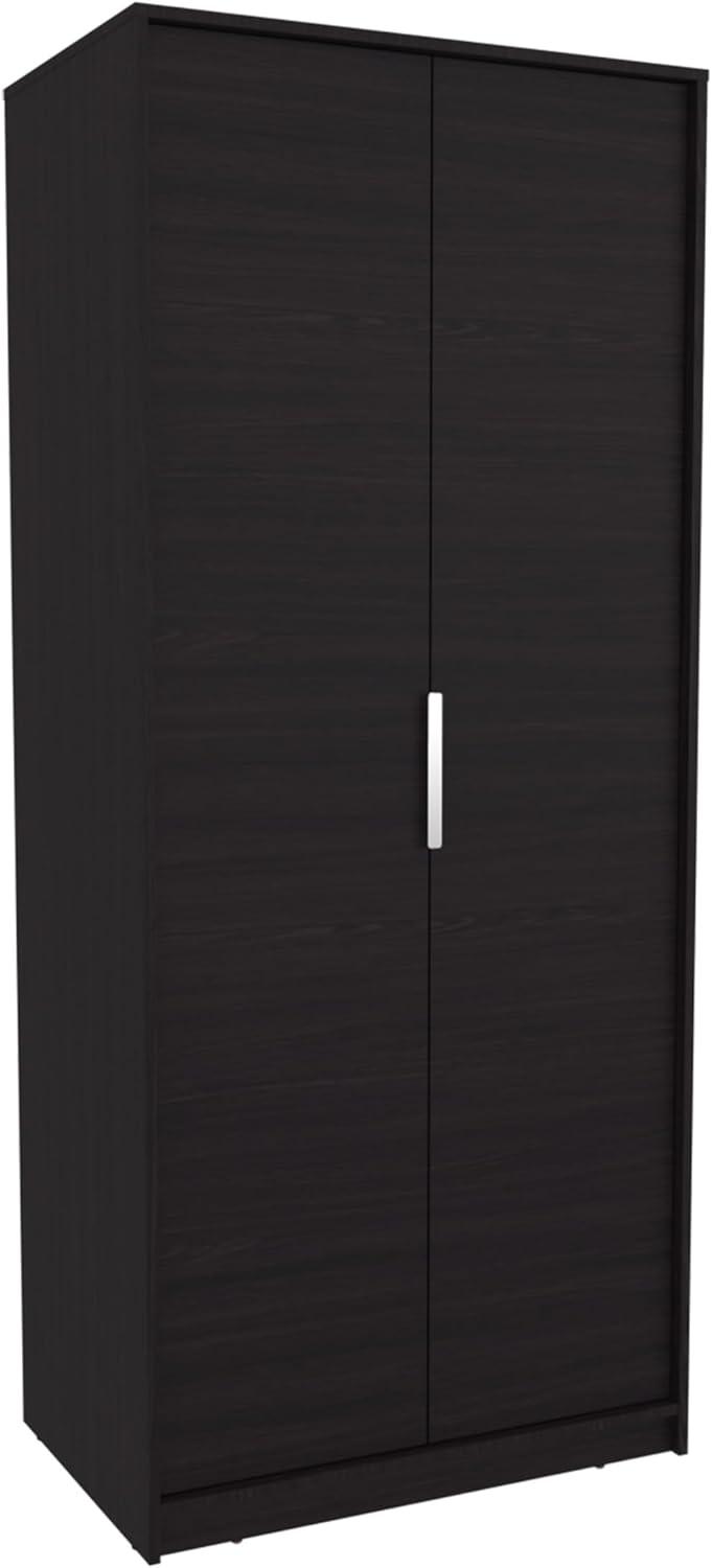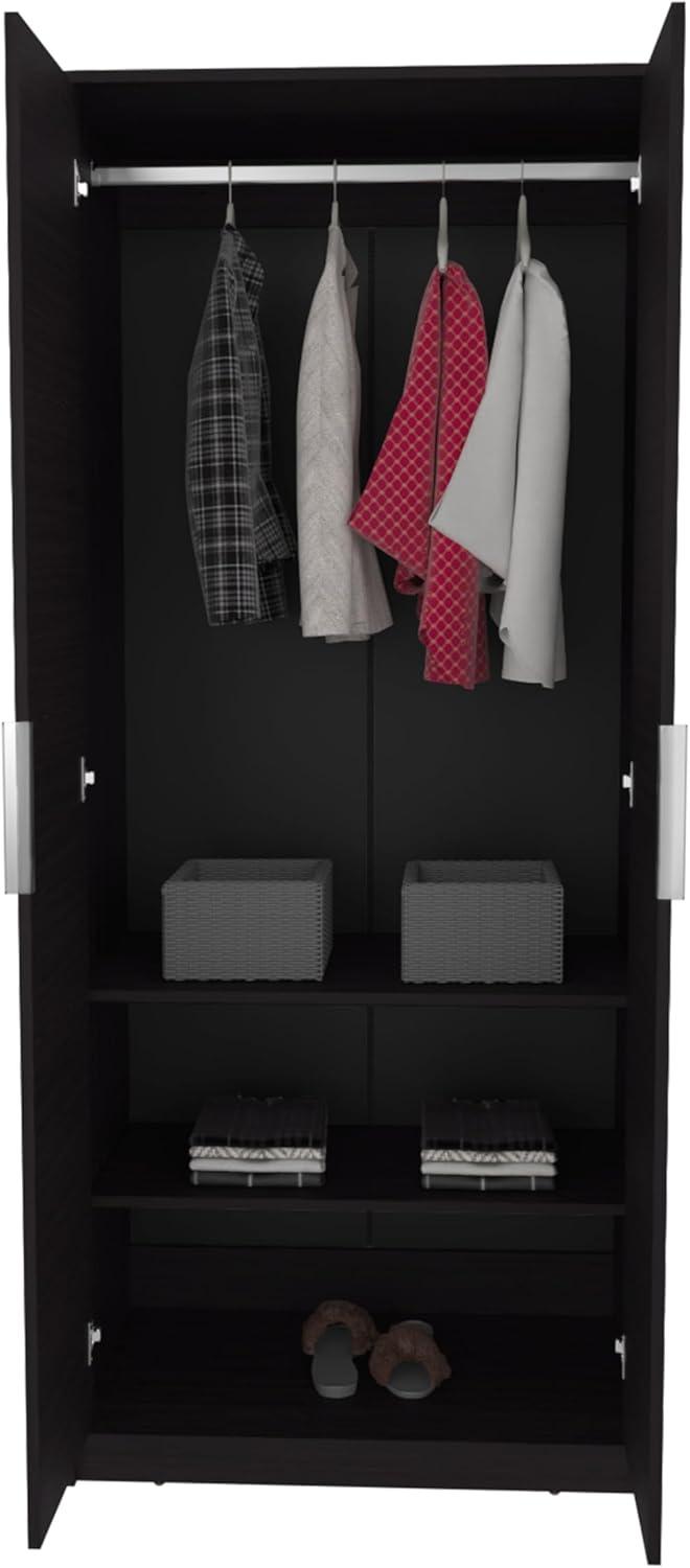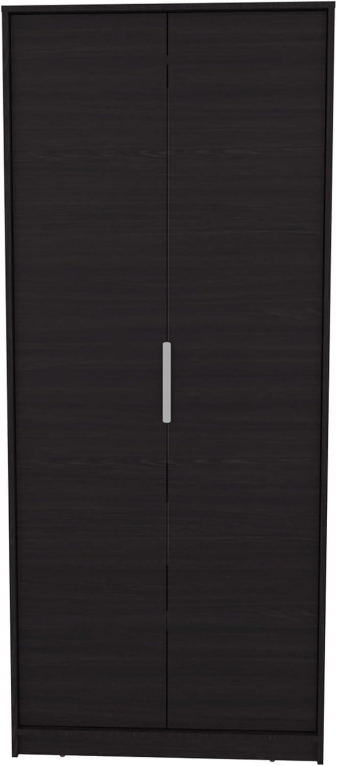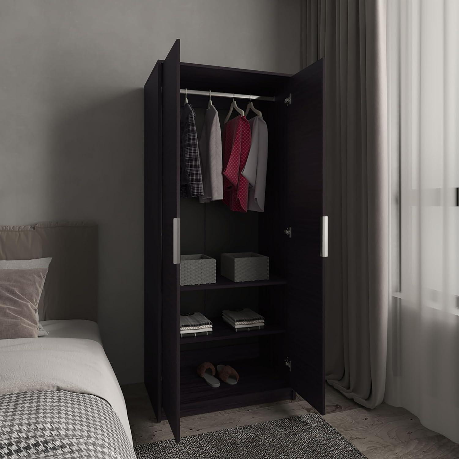 This wardrobe is a smart solution for anyone dealing with limited space but still craving style and functionality. Its tall and slim profile fits effortlessly into compact areas like small bedrooms, guest rooms, or studios, maximizing vertical storage without overwhelming the room. The sleek black finish paired with handle-free double doors creates a clean,modern vibe that works beautifully in contemporary or neutral-themed interiors. Inside, the combination of a hanging rod and multiple sturdy shelves gives enough versatility to neatly organize everything from hanging garments to folded essentials.