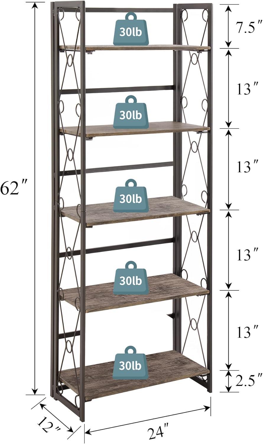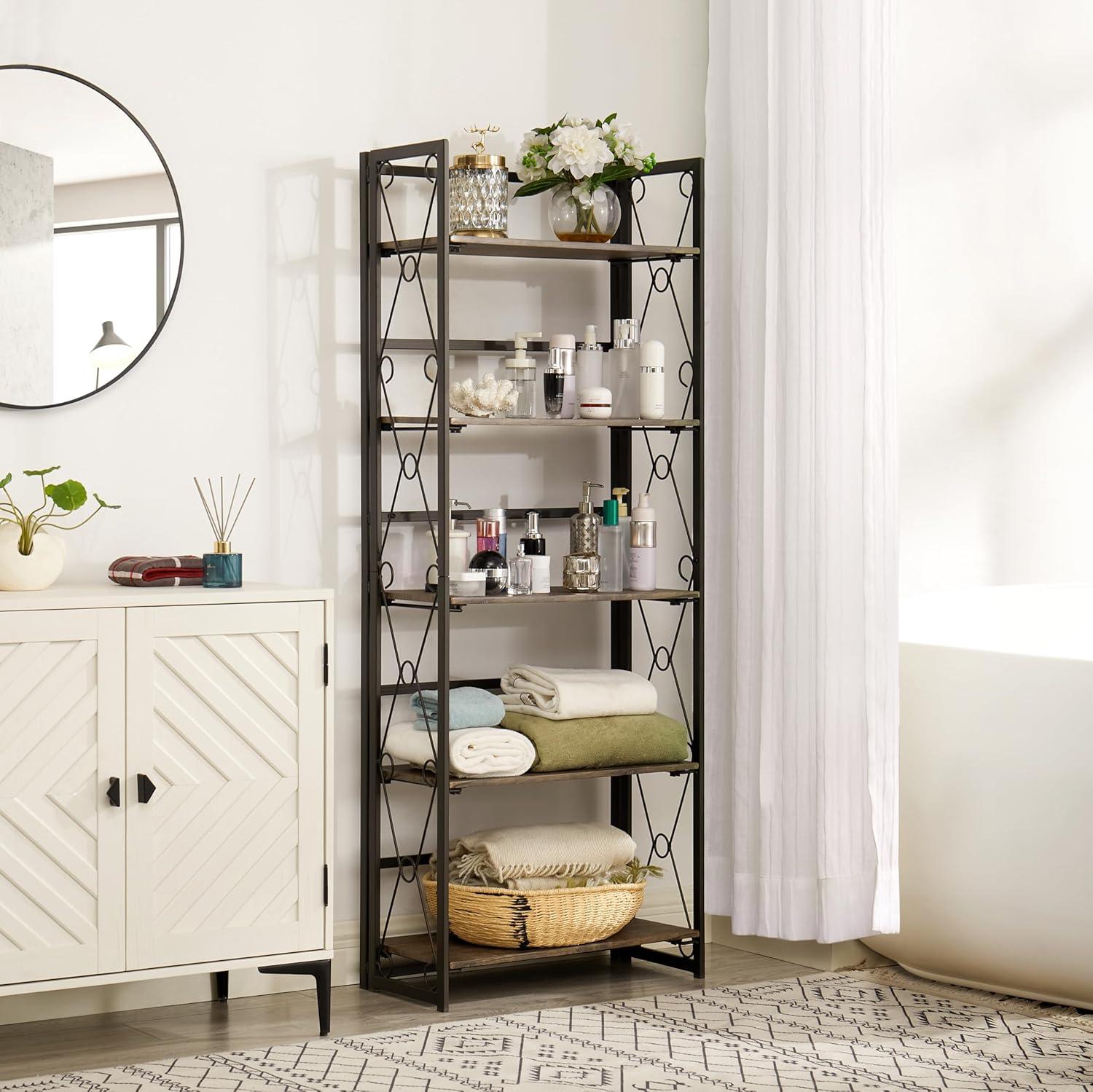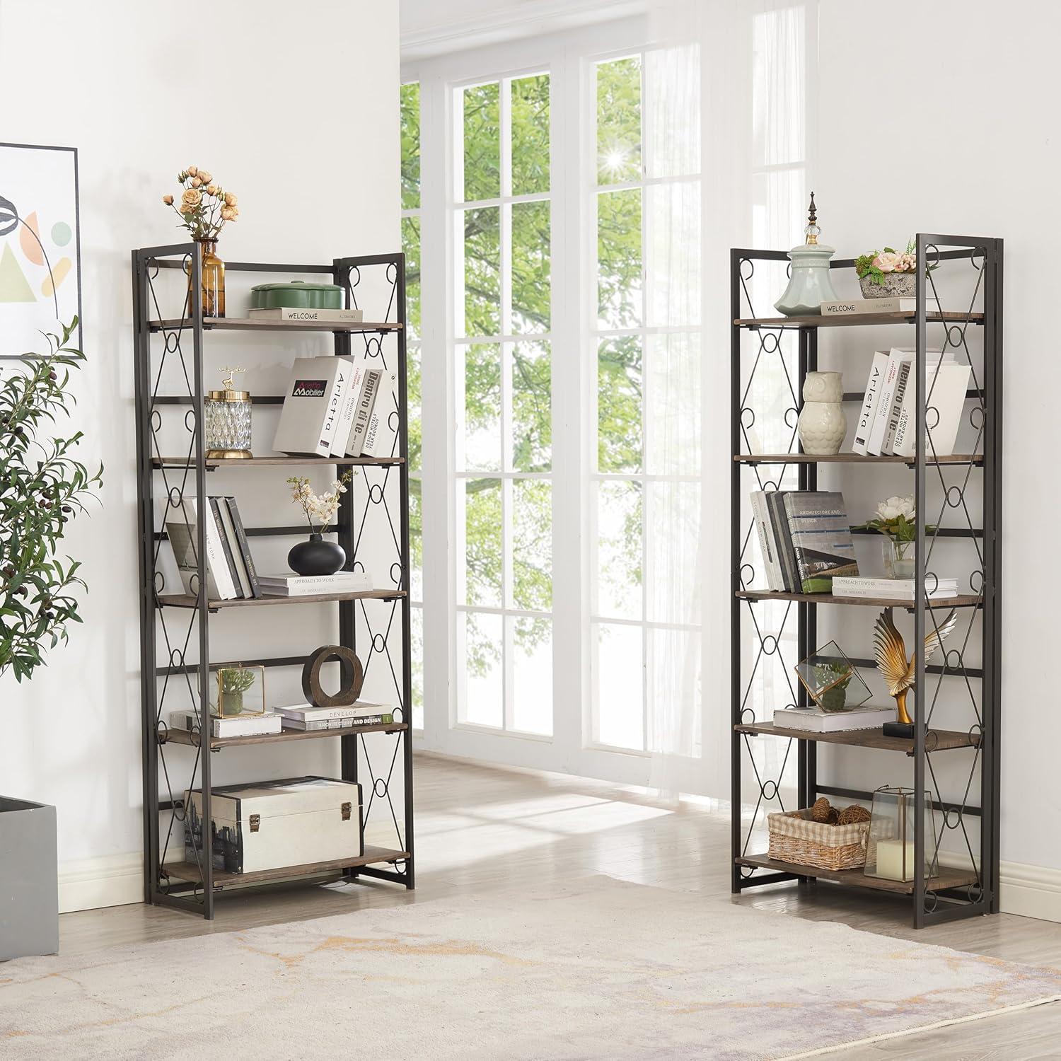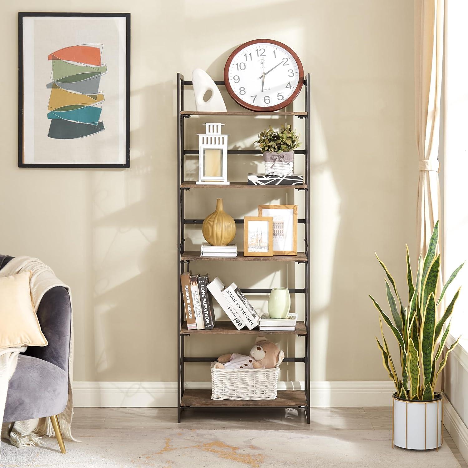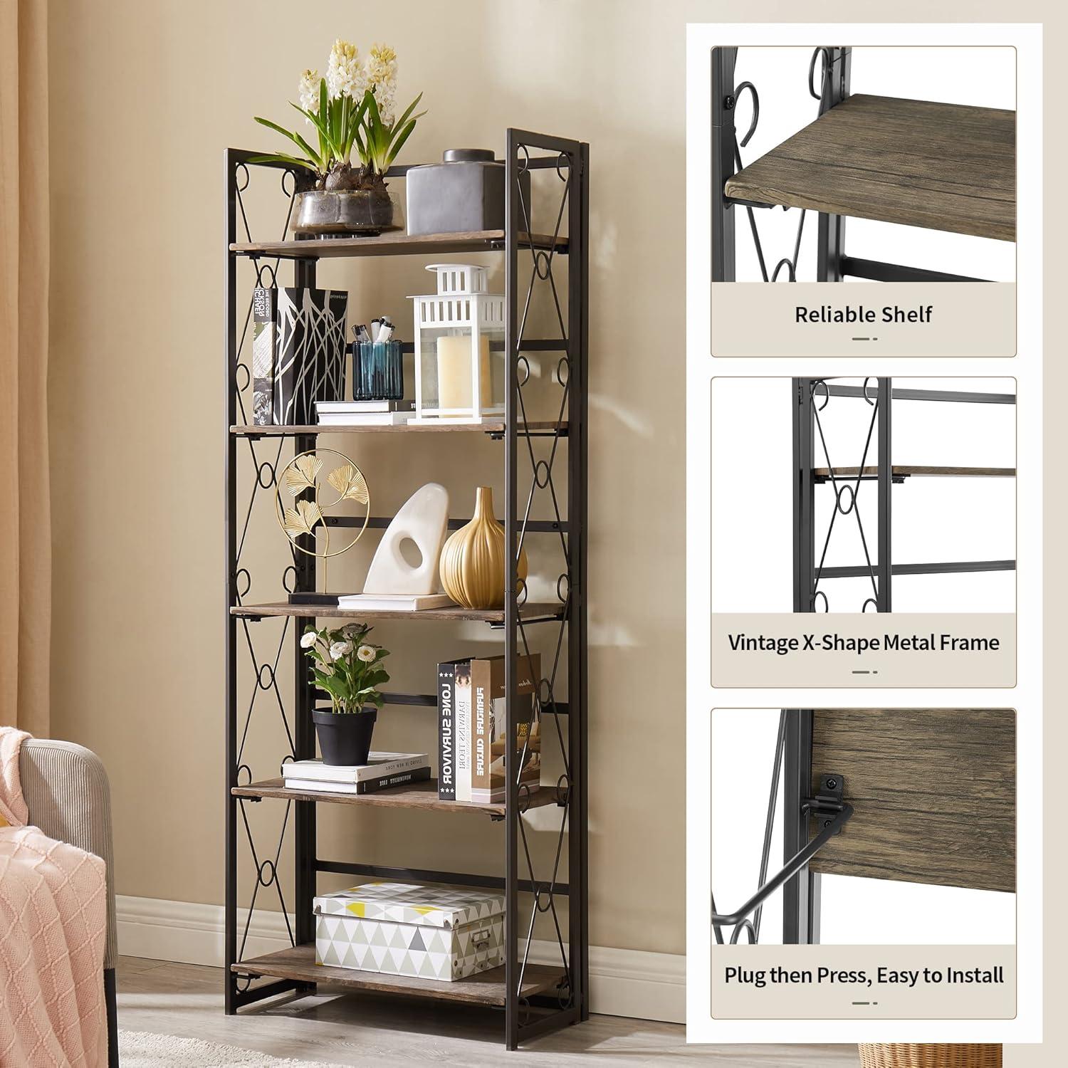 Beyond the obvious space-saving benefits, the foldable aspect adds a layer of versatility that supports a variety of uses throughout our home or office. Whether set up in the living room as a stylish display or folded and stored away after an event, the sturdy industrial metal frame paired with engineered wood keeps it both strong and reliable. The open back design and five spacious tiers adjust effortlessly to different organizing needs – from books and plants to kitchen gadgets and office supplies. here’s a quick overview of what the foldable feature brings to the table: