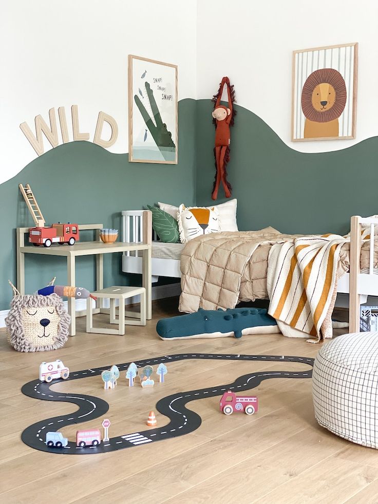 Another great way to add a playful touch to the room is by including unique and creative storage solutions that double as decor. Think about adding shelves in the shape of clouds, cars, or animals to not only provide storage for toys and books but also serve as eye-catching decorations. You could also consider using colorful bins and baskets to keep the room organized while adding pops of color.