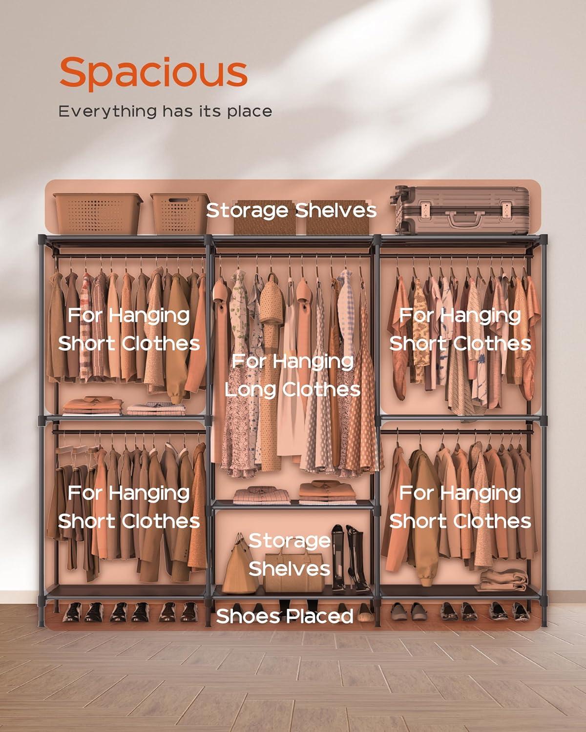 Our experience with this spacious and well-designed clothes organizer has been overwhelmingly positive. The extra large capacity,measuring over 80 inches in length and nearly 78 inches tall,offers ample space to store an impressive amount of clothing. With five hanging rods-four for short garments like shirts and jackets, and one for longer items such as dresses and pants-it keeps everything neatly organized and wrinkle-free. The multiple shelves are perfect for folded clothes, shoes, and storage boxes, helping maximize vertical and horizontal storage.We particularly appreciated the thoughtfully raised hanging heights of 34.6 inches for shorter items and 52 inches for long garments, which accommodated our varied wardrobe seamlessly.
