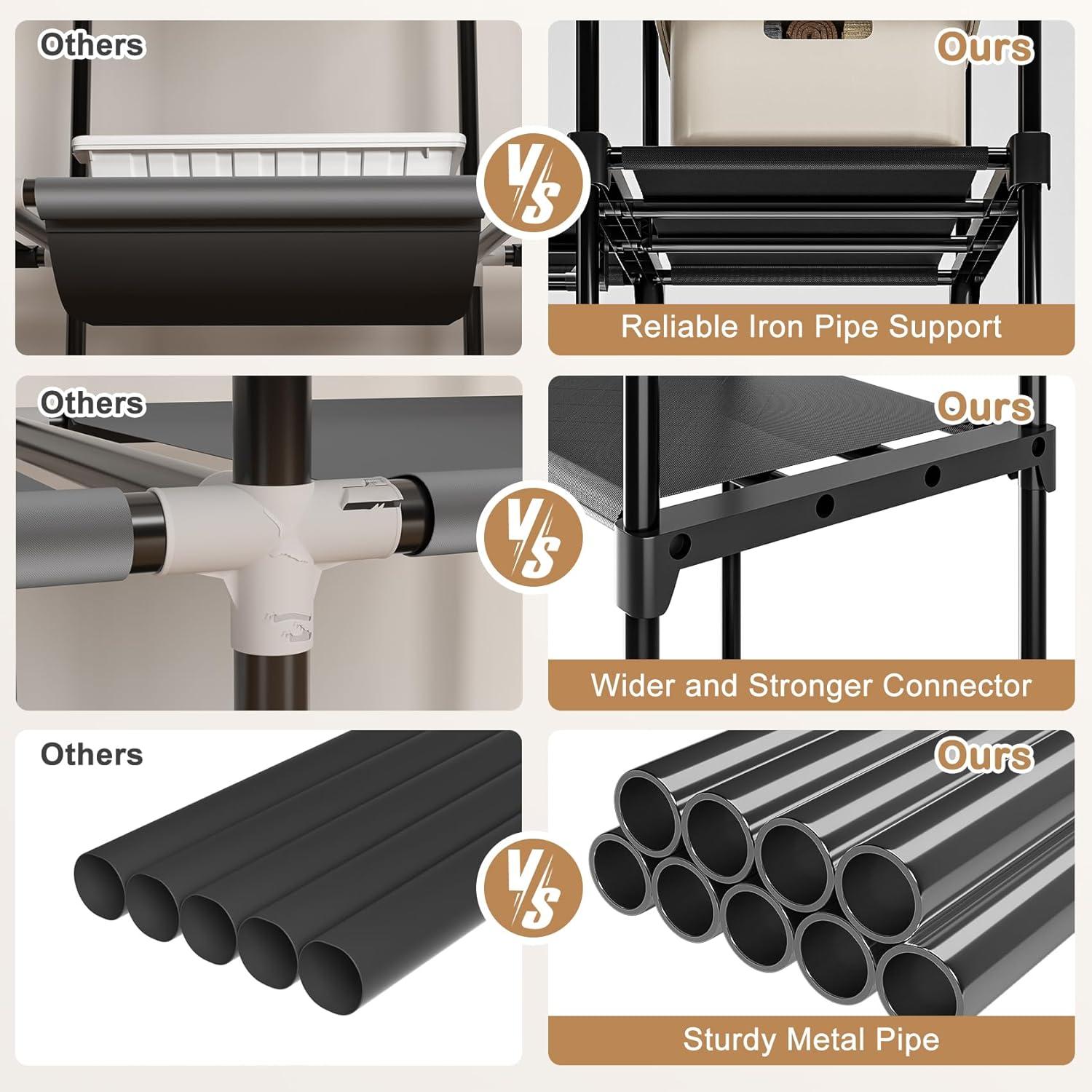 We found the construction to be impressively sturdy,thanks to its 16mm thickened metal pipes combined with reinforced plastic connectors. This robust design provides exceptional stability, easily supporting daily storage needs without wobbling or sagging. Each shelf accommodates up to 20 lbs,while the hanging rods can hold heavier items up to 50 lbs safely,making it perfect for a range of garments from heavy coats to delicate dresses. The metal-plastic combination also ensures resistance against bending or damage over time, enhancing the longevity of the unit even with frequent use.