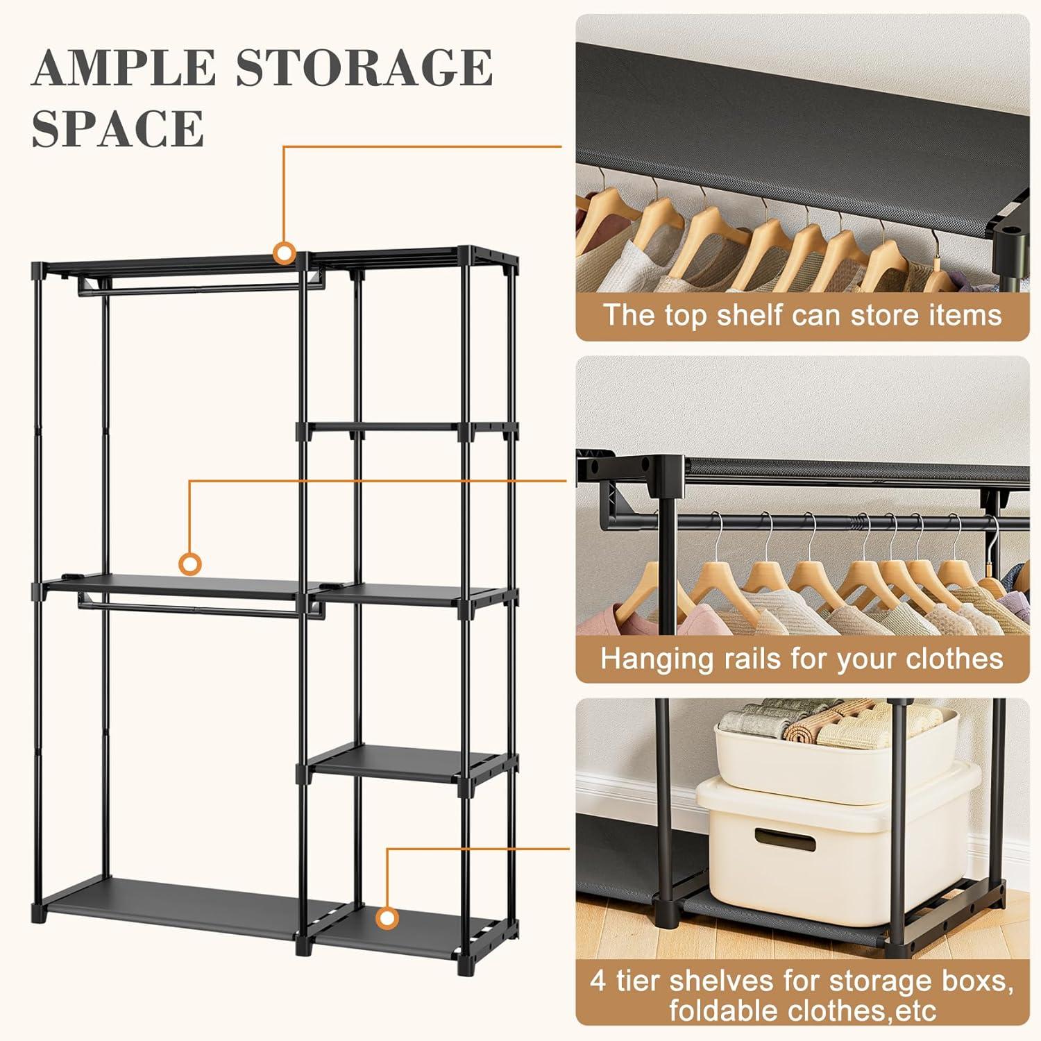 We found this freestanding wardrobe incredibly adaptable, fitting seamlessly into a wide range of environments. Whether nestled in a compact dorm room, placed in a cozy bedroom, or positioned in a rental unit, its open design and modular components provide flexible storage options that cater to varied lifestyles.The dual hanging rods and four spacious shelves allow us to customize the layout-removing the middle rod easily creates extra height for long dresses or coats, which is perfect when our storage needs shift. Its sleek, breathable frame also allows clothing to stay fresh, and the absence of fabric covers means instant access and visibility without rummaging.