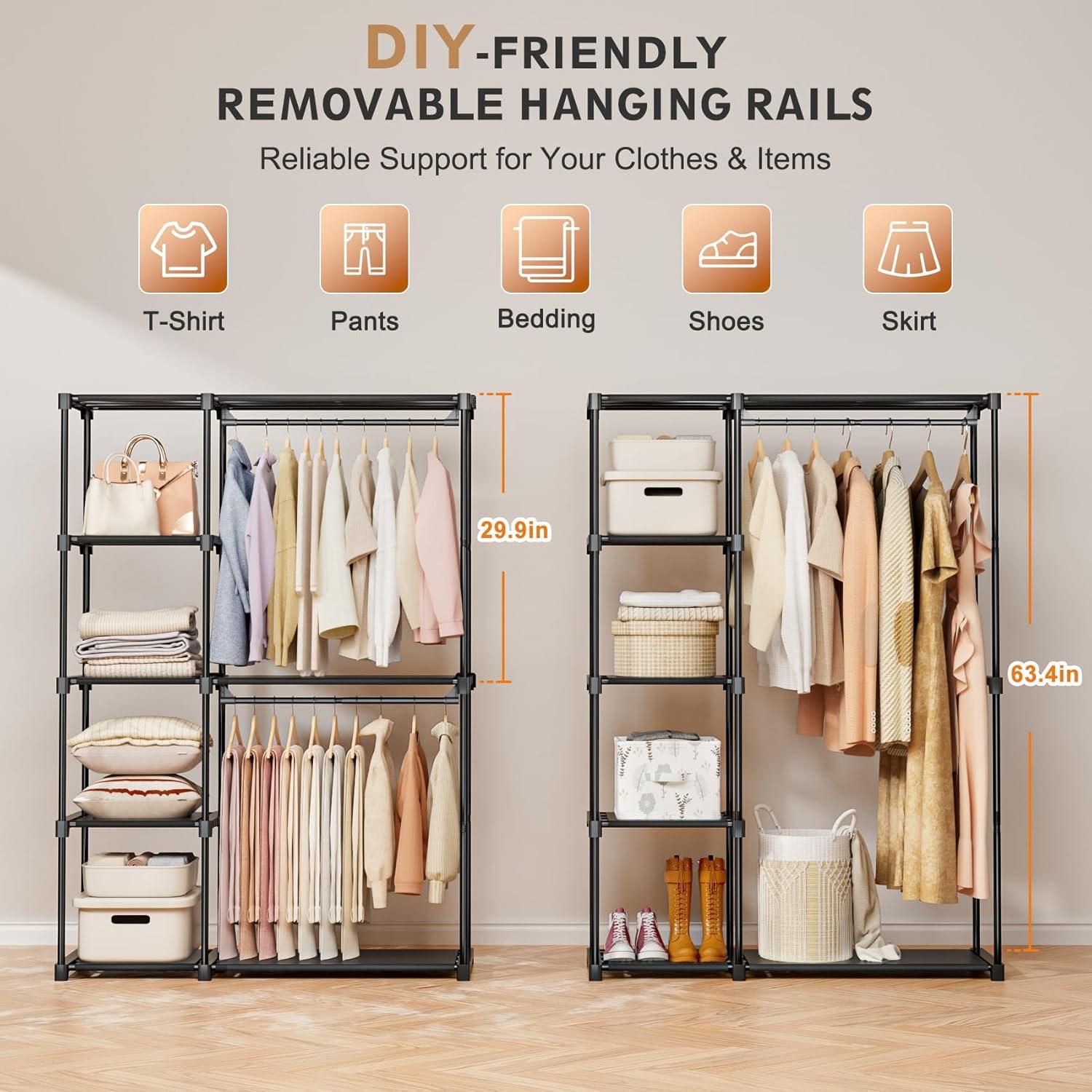 The flexible layout reinforces its practicality. Featuring two hanging rods that can each support up to 50 pounds and four spacious shelves rated for 20 pounds apiece,this setup adapts effortlessly to our wardrobe needs. We especially appreciate the option to remove the middle rod, which allows for hanging longer garments like gowns or coats without issue.Whether placed in a bedroom, dorm, or rental unit, the simple yet efficient assembly process-using only metal tubes and plastic connectors-gets our closet ready in under 20 minutes without extra tools.