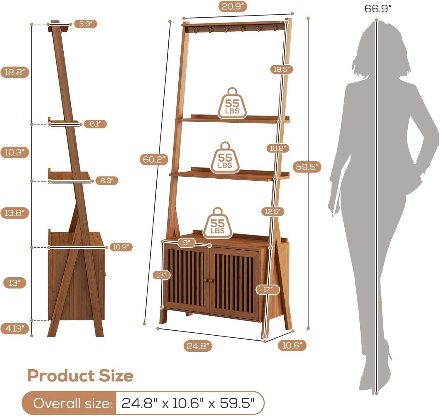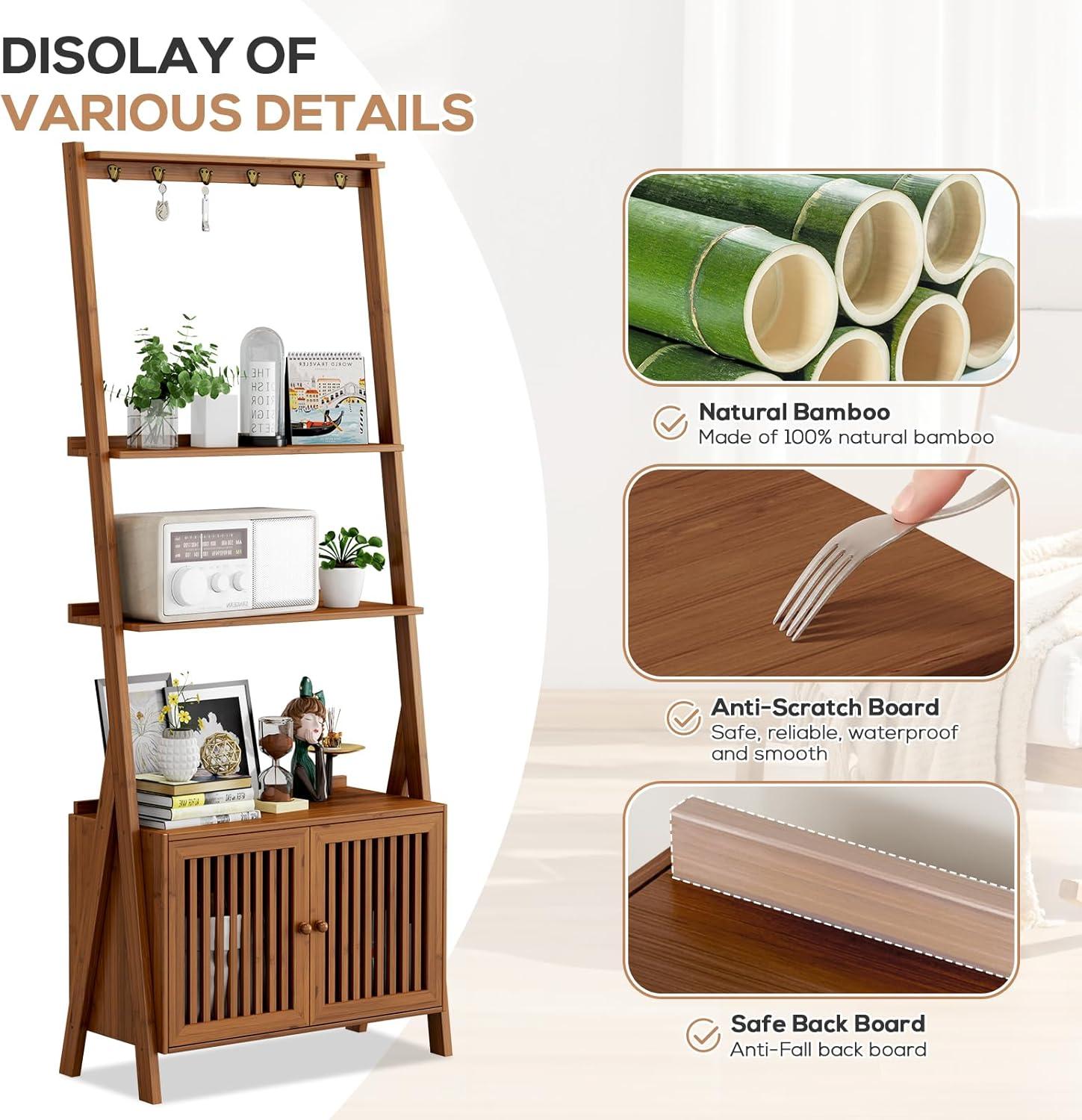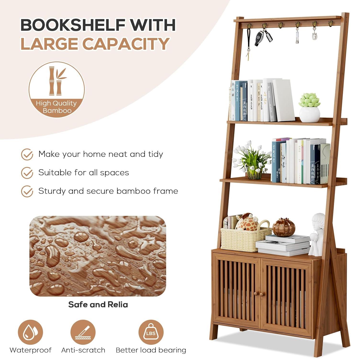 From the moment we unpacked this ladder-style bookshelf, the quality of the natural bamboo material was promptly apparent. It feels remarkably sturdy yet lightweight, adding an elegant warmth to any room without overwhelming the space. The clever design features three spacious open shelves with safety back panels, ensuring that books, plants, and decorations remain securely in place. The addition of six hooks expands its functionality,perfect for hanging small bags or accessories,while the bottom cabinet with doors offers a private spot for meaningful documents or personal belongings. This combination of open and closed storage makes it a versatile solution for living rooms, bedrooms, offices, or even balconies.