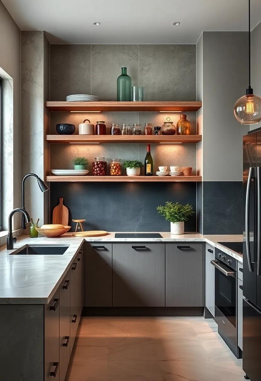 Incorporating layered lighting into open shelving transforms simple storage into a dynamic focal point, especially in compact kitchens where every inch counts. Ambient, task, and accent lights work in harmony to create depth and warmth while delineating various zones on the shelves. Imagine soft LED strips nestled beneath each shelf combined with strategically placed spotlights—this not only illuminates the items but also adds a cozy glow that draws the eye upward, creating an illusion of height and spaciousness.