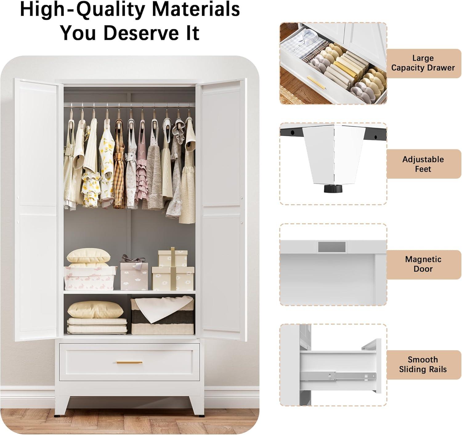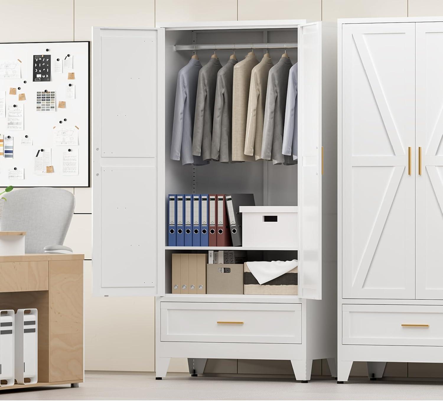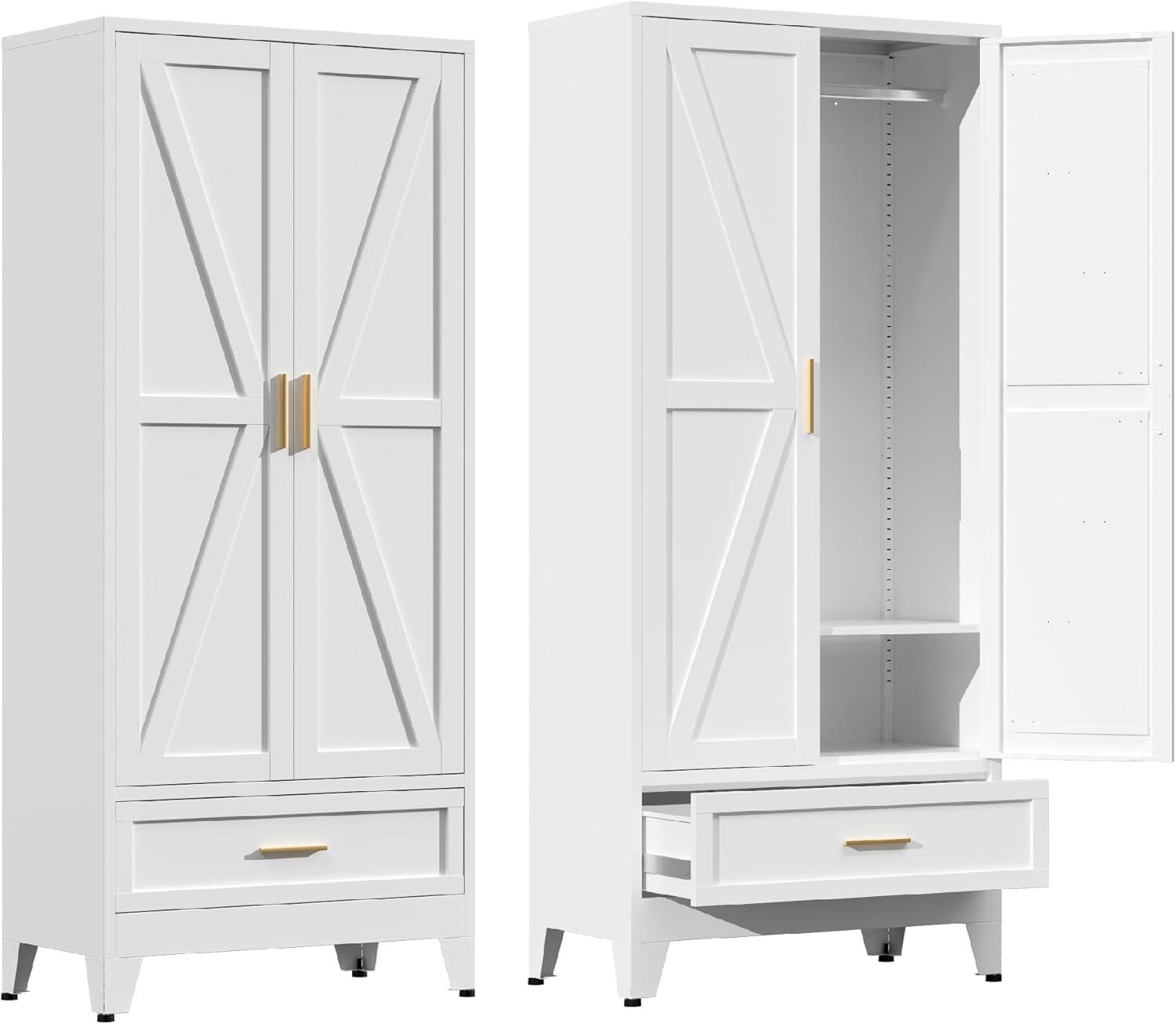 Light catches the faint texture in the painted metal and you notice the piece has more visual weight than its white finish suggests.The product listing — sold without a clear brand and titled “Metal Armoire Wardrobe Closet with Drawer, Farmhouse White Wardrobe Cabinets” — reads as a mouthful, so think of it simply as the farmhouse metal armoire. At about 71 inches tall it towers just enough to change the room’s proportions; the steel feels cool under your hand, the barn‑door panels soften that industrial edge, and the low drawer slides with an unfussy, practical glide. From a few steps away it reads like a quietly steadfast presence rather than a showpiece.