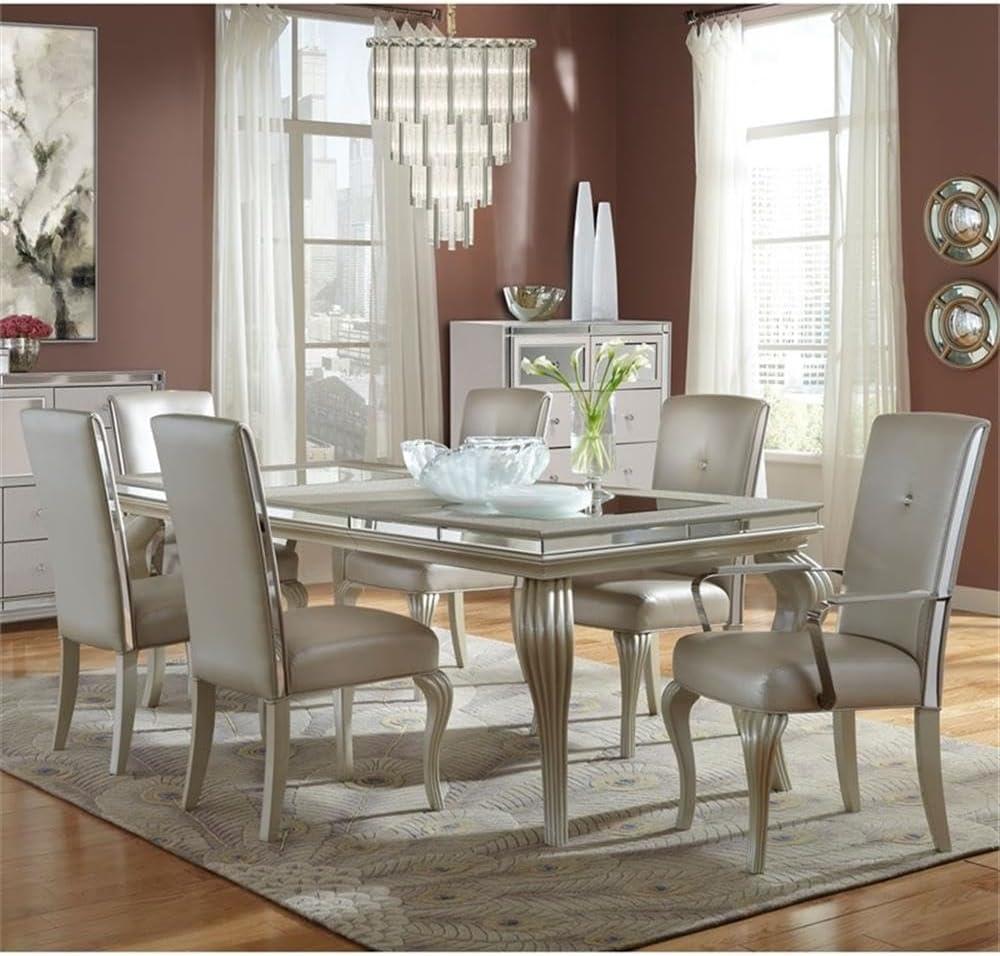 Catching the late-afternoon light, the beveled mirror inlays scatter tiny flashes across your floor and make the room feel unexpectedly brighter. The MICHAEL AMINI Hollywood Loft wood & Glass Dining Table in Frost Ivory — the Hollywood Loft,for short — has a quite,substantial presence: broad enough to anchor your dining area,yet pulled together by shapely tapered legs that keep it from looking bulky. Run your hand along the top and you’ll notice the textured vinyl reads almost like leather under your fingertips, while the mirrored trim on the apron throws brief, shallow reflections when you lean close. Pull the leaf and the top stretches across the room, changing sightlines and the way furniture relates to it; kept closed it still holds a solid visual weight. At first glance the mix of glossy glass flashes and a frosted ivory surface feels cinematic but lived-in, a piece you notice as much for its scale as its shine.
