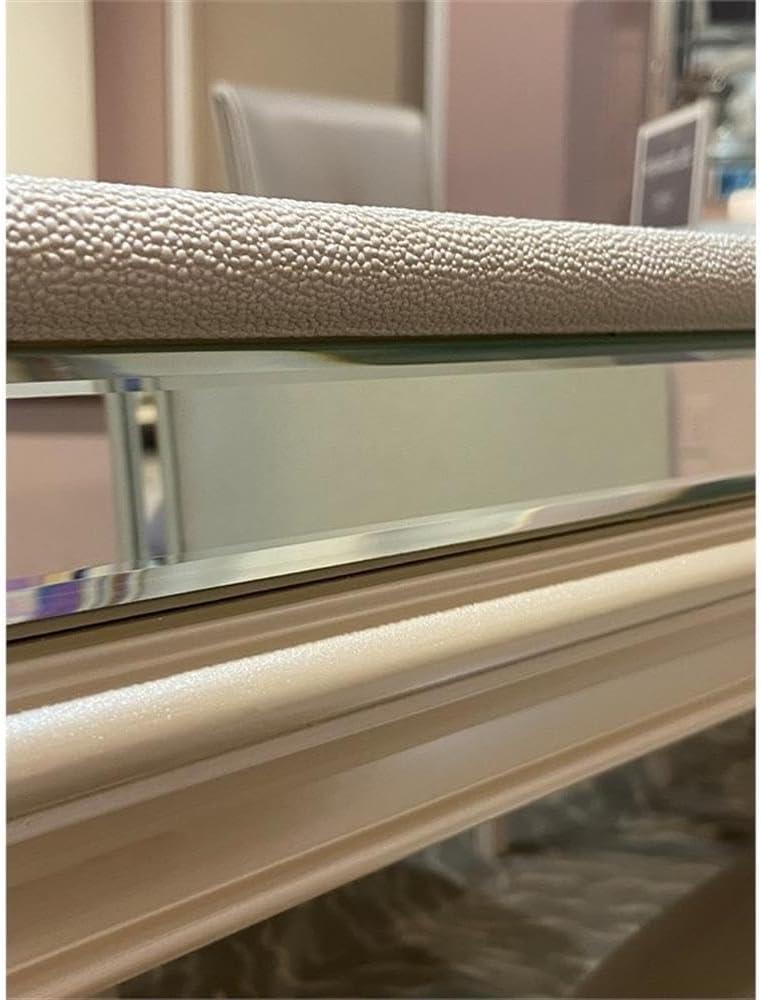 At a first glance the finish reads as a pale, warm ivory, though the tone changes with the light — cooler by a radiant window, slightly creamier under softer bulbs.The mirror inserts catch light even through their protective film, throwing back distorted reflections until the film is removed. small bevels at the mirror edges and the mirrored apron trim are visible where the film lifts; you find yourself smoothing a few seams and wiping away fingerprints on the vinyl where the packaging rubbed.Hardware is bagged and labeled, and the instruction sheet sits on top, folded where someone reached in first.A couple of pre-drilled holes and locator pins are apparent on the underside of the top and on the legs,suggesting parts will mate without much searching during the initial assembly.