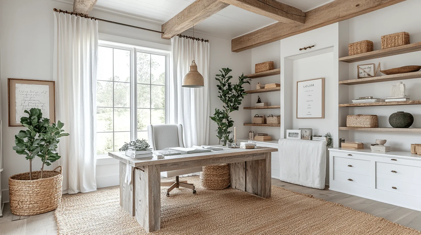 Emphasizing clean silhouettes and minimal clutter, this design merges modern aesthetics with farmhouse textures like wood and stone. Built-in shelving and neutral-toned furniture create a harmonious and orderly environment, ideal for maintaining focus. Carefully chosen decorative accents add personality without overwhelming the space.