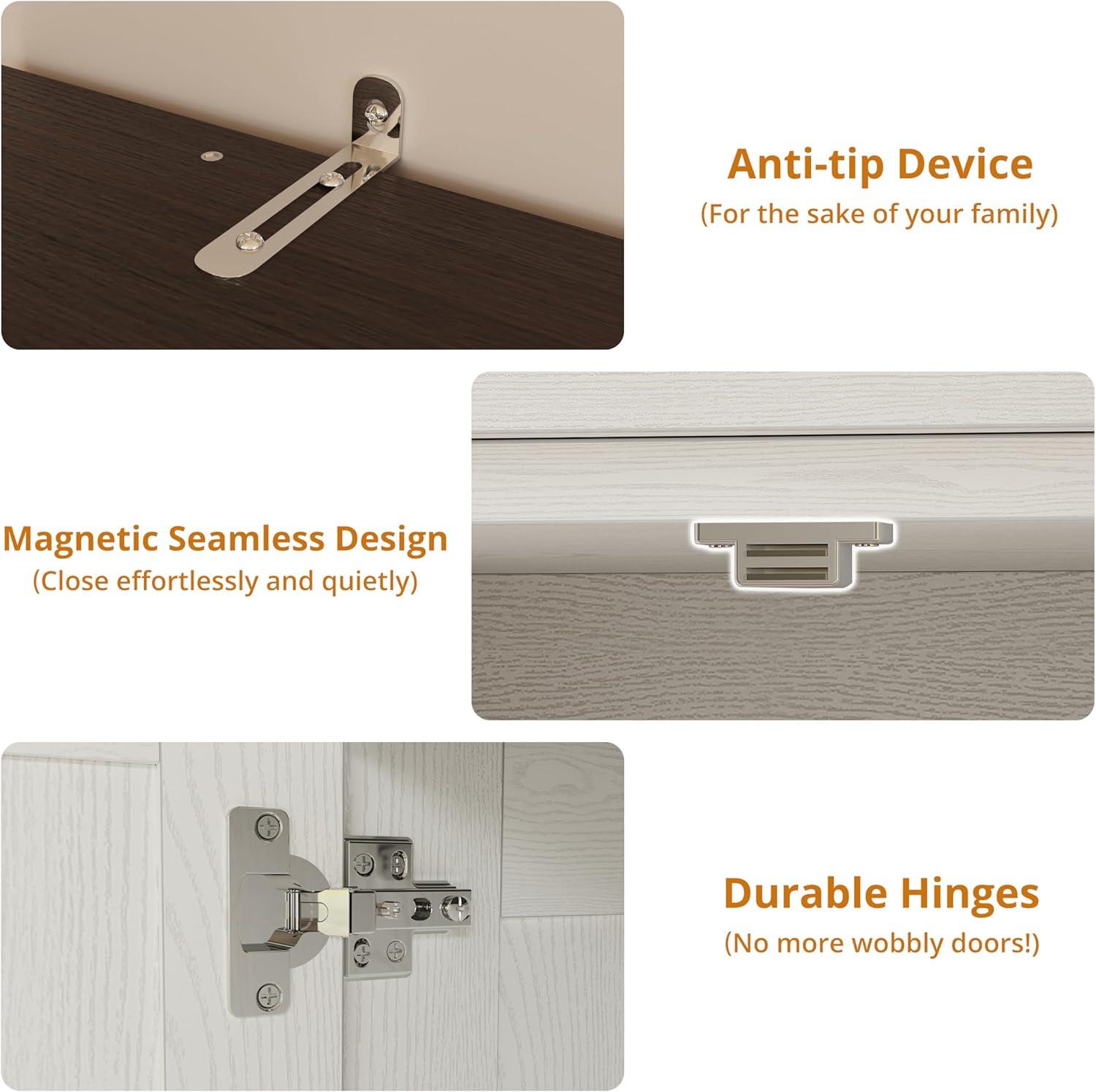 Hardware and fastenings tell their own story when the unit is assembled and handled. Hinges present a quick visual cue: screws seated flush on some doors, slightly countersunk or short on others, with corresponding small shifts in door alignment during repeated opens and closes. Magnetic catches engage with a sharp snap when aligned, but the strike plates and mounting screws can sit shallow enough that the door’s pull requires a firmer tug to reseat. Pulls and handles occasionally show slight rotation under finger pressure if the backer screw doesn’t run far enough into the drawer front. Tiny burrs or debris around some screw heads are noticeable on inspection of shipped pieces.