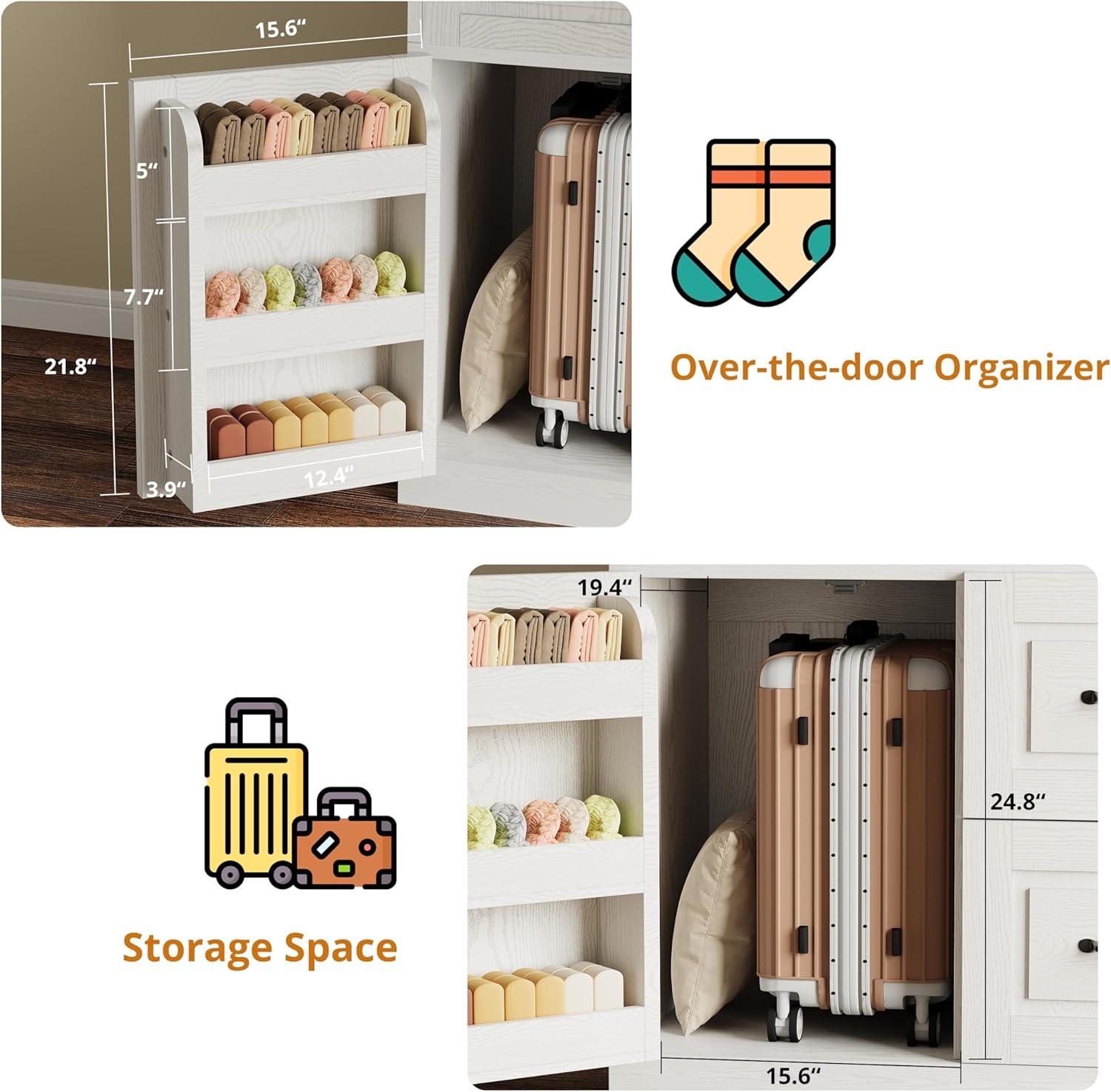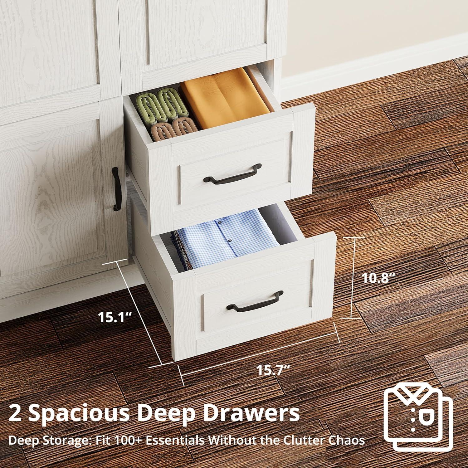 You catch it out of the corner of your eye and then step closer: the ModernMate Armoire Wardrobe closet (the 71‑inch freestanding wardrobe) feels like an intentional piece rather than a temporary add-on. The white finish looks matte under the lamp, a little toothy where your hand brushes the door, and the metal handles are cool and ample beneath your palm. It occupies height more than breadth — the top shelf sits just below sightline and the lower drawers close with a hollow, reassuring thud — so the roomS proportions subtly shift when you stand beside it. Small imperfections in the paint and the slight give of the doors read as lived-in details rather than factory perfection.