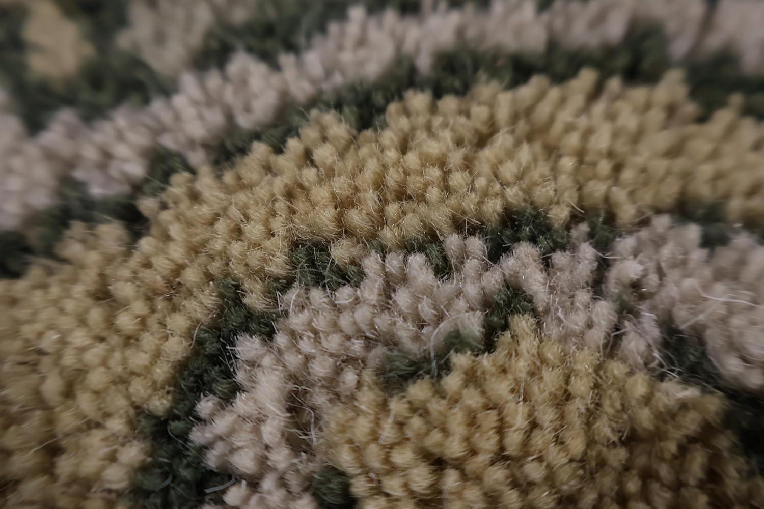 Up close the texture is what makes the strongest impression. The surface gives slightly under your step and shows the direction of movement in faint bands; when you smooth a cushion or nudge a chair leg, the nap reorients and the tones deepen in places.You notice small, artisan-like irregularities — tiny differences in loop height and stitch density — that read as lived-in detail rather than precision uniformity. In most cases the edges lie flat, though they may catch briefly when someone scoots a chair; the rug also tends to hold light traces of traffic or vacuum lines until the pile settles again.