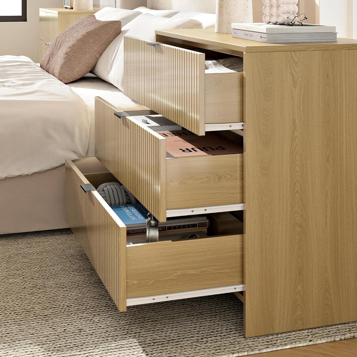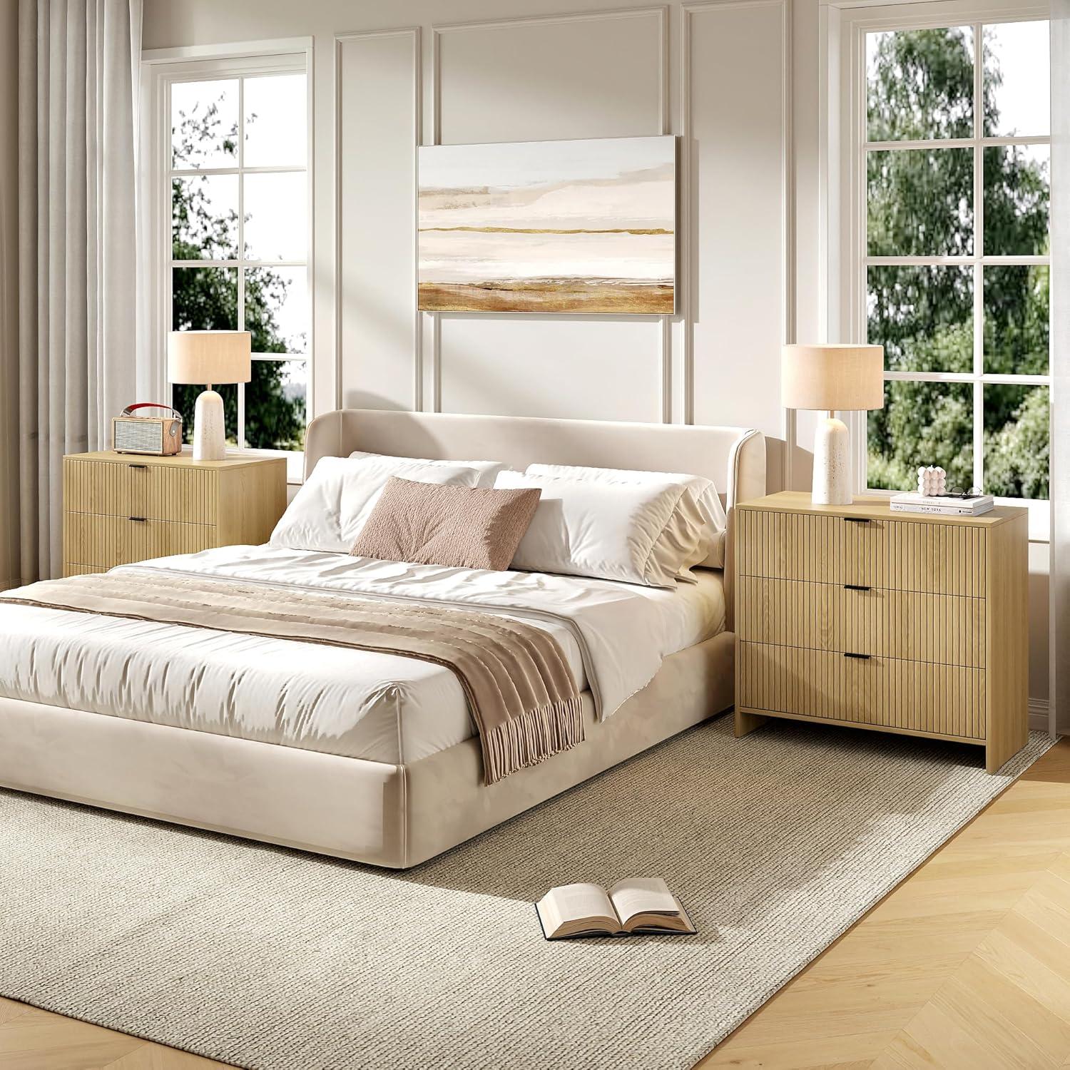 When you first step into the room, the pair reads as more than furniture — they stake out the ⁤bedside. The taller, wider profiles ‍interrupt the horizontal sweep of the bed and night linen, catching your ​eye with the vertical grooves that throw ⁣light ‍and shadow across the fronts. The natural oak​ tone warms the corner without calling attention to itself, while the dark pulls punctuate the silhouette in short, intentional beats. From across the room they give the space a measured presence; up⁣ close, grain and⁤ finish⁢ reveal small variations ‌that make each piece look lived-in already.
