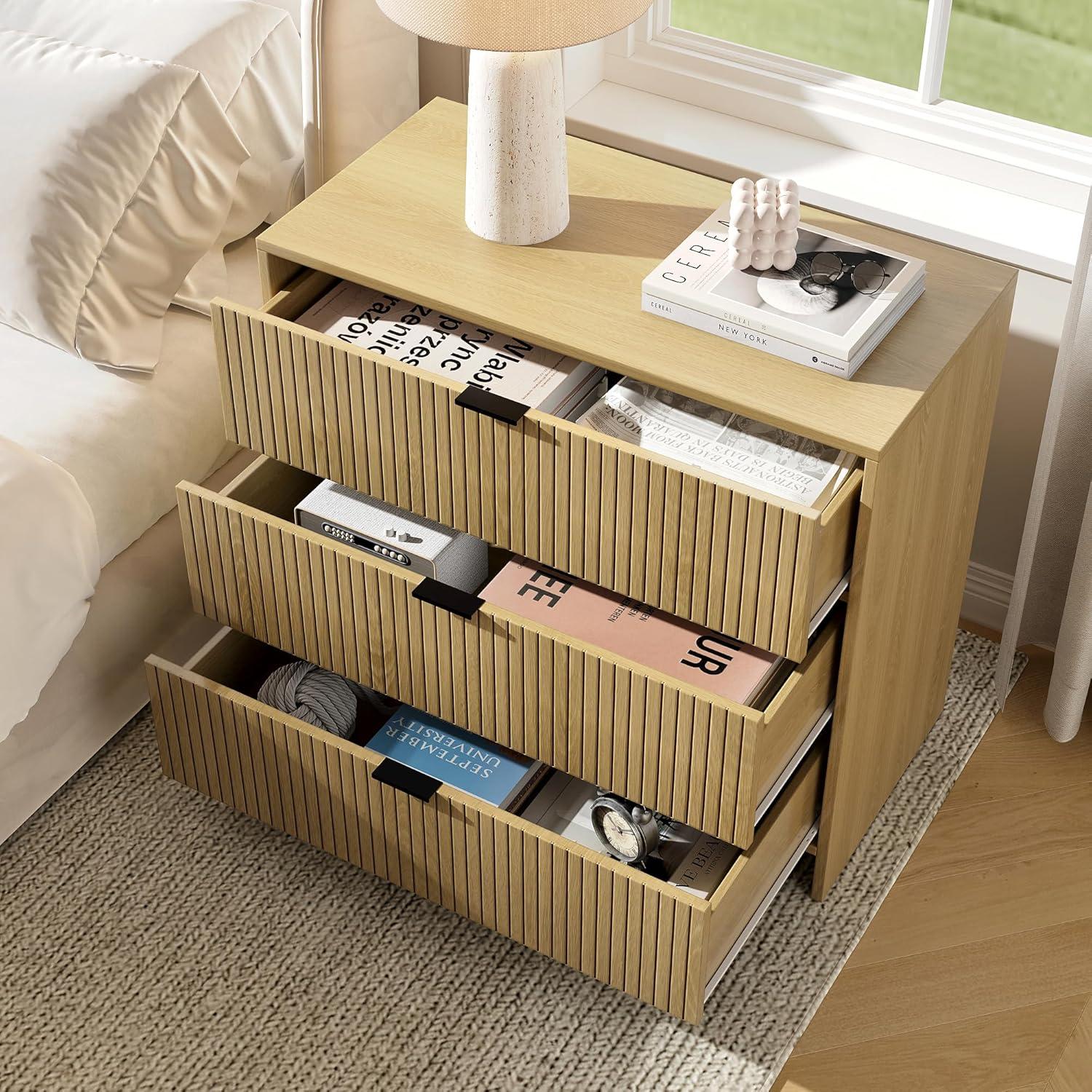 You’ll often notice the piece reads like a quiet anchor beside the bed: ‌the vertical grooved ⁣panels catch light at an angle, throwing narrow shadows across the top surface, while ⁤the ‌dark pulls punctuate the front like small, steady ⁣accents. When you reach for a book or tilt your lamp, the top feels⁤ broad enough to hold a​ few​ items without everything ⁢spilling toward the edge; fingers brushing the ‌edge tend to leave the occasional fingerprint on the finish, and ⁣opening a drawer is a little habitual movement—pause, tug, ⁣and the face​ slides out with a soft, incremental reveal.