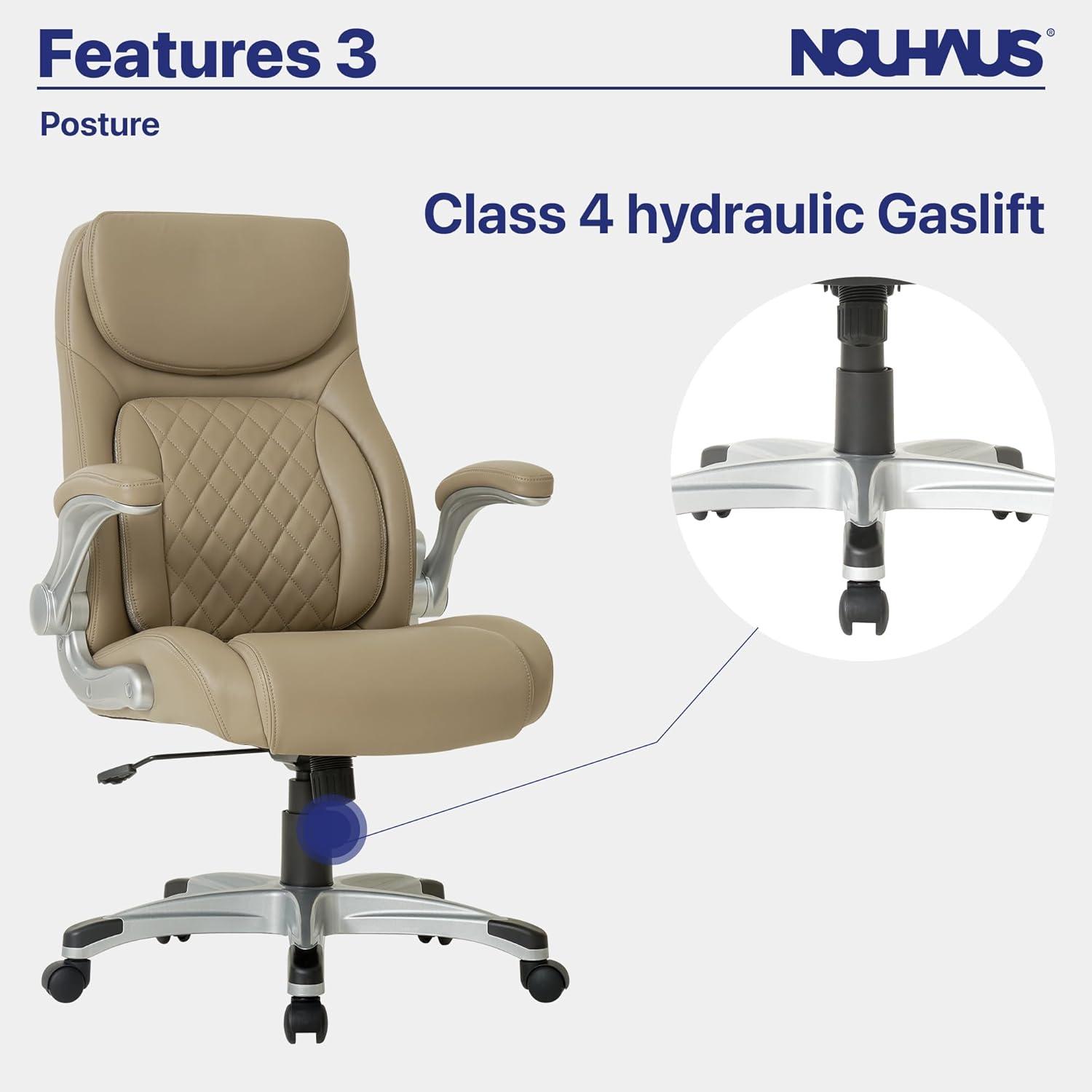 Over time the nouhaus +Posture Ergonomic PU Leather Office Chair, Click5 Lumbar Support with FlipAdjust Armrests, Modern Executive Chair and Computer Desk Chair (Taupe) stops announcing itself and simply becomes another presence in the room, its taupe surface softening and the armrests showing the quiet marks of regular use. You notice how the way the space is used shifts in daily routines — a favoured corner for a laptop, a place where bags are draped, the chair folding into the rhythm of coming and going. Comfort turns into expectation rather than comment, and the finish takes on the soft wear of ordinary days. It stays.