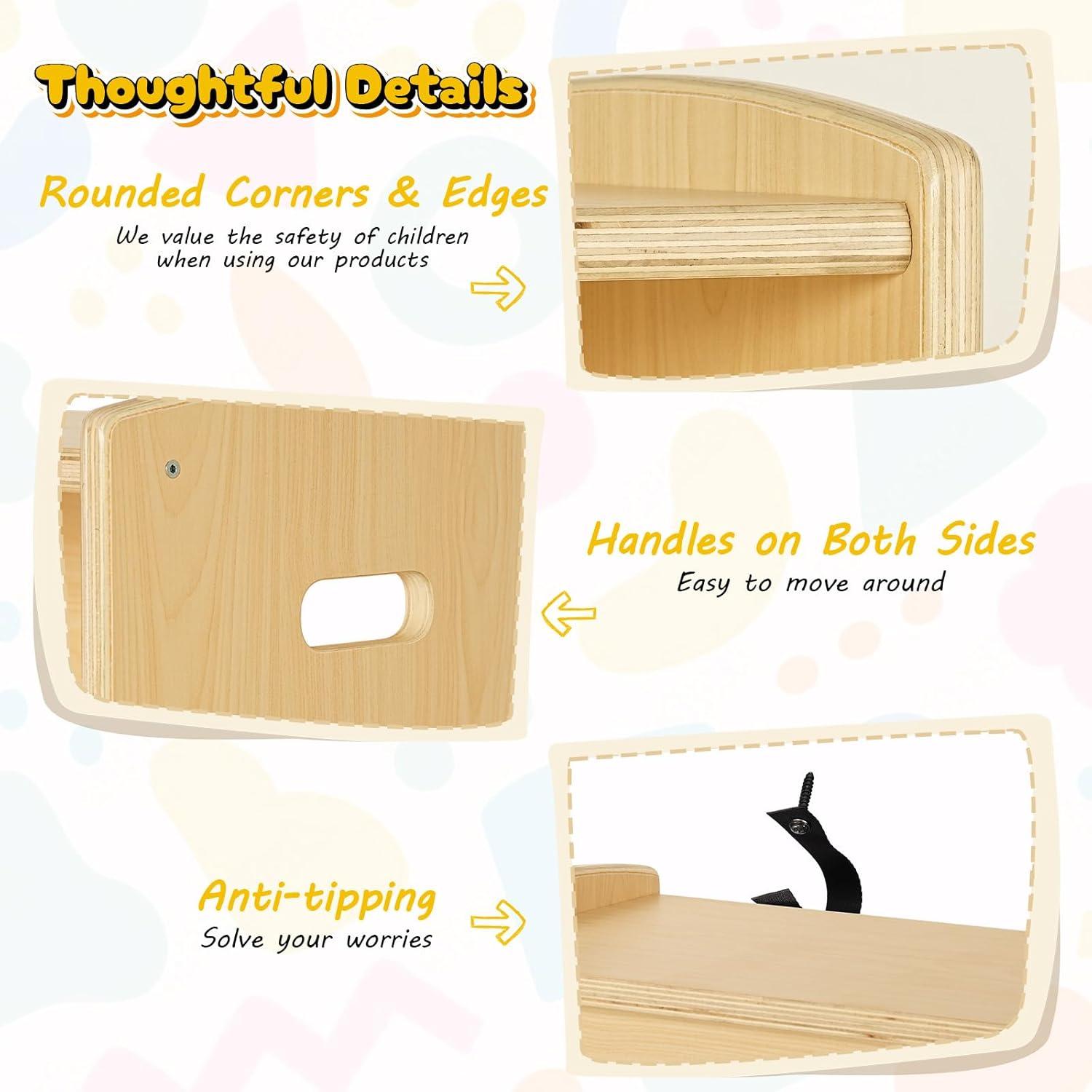 Over time you notice the ONBRILL 2-Tier Wood Montessori Cabinet for Kids, toddler Room Book Shelves Toy Organizers and Storage, Small Book Shelf Storage for Baby Children, Furniture of Classroom, Nursery, Playroom finding its usual corner, books leaning a little, toys pooled on the lower shelf. In daily routines it quietly guides small movements—where a child reaches, where you pause to straighten a stack—and the top gathers fingerprints and soft scuffs as the room is used. Its comfort is revealed in those habitual interactions, the way surface wear reads like memory rather than damage, and its presence becomes part of regular household rhythms. It stays.