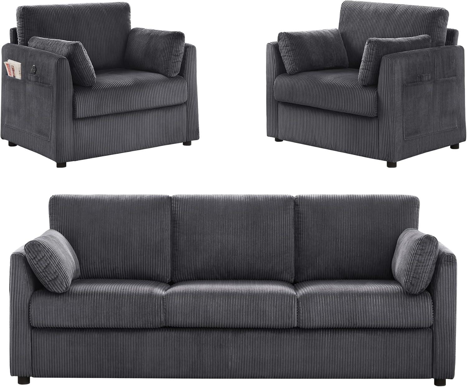 We found this sofa set to be an excellent blend of style and function. The soft, durable corduroy upholstery promptly stood out-it’s not only pleasing to the touch but also breathable and resistant to spills, making it incredibly practical for everyday use. The 3-seat couch paired with the two accent chairs offers flexible seating options that suit both small apartments and cozy living rooms. Assembly was straightforward and took roughly 20 minutes, even when done solo, thanks to the clear instructions and well-packaged components. the modern grey color fits seamlessly with various décor styles, enhancing the room’s vibe without overwhelming the space.