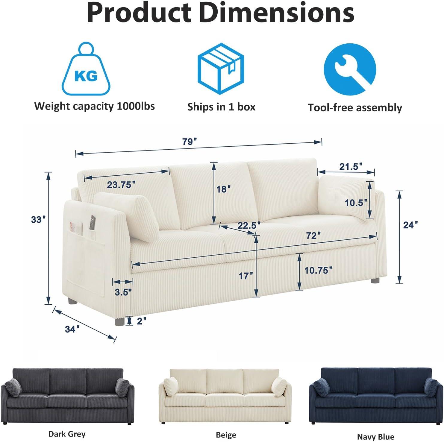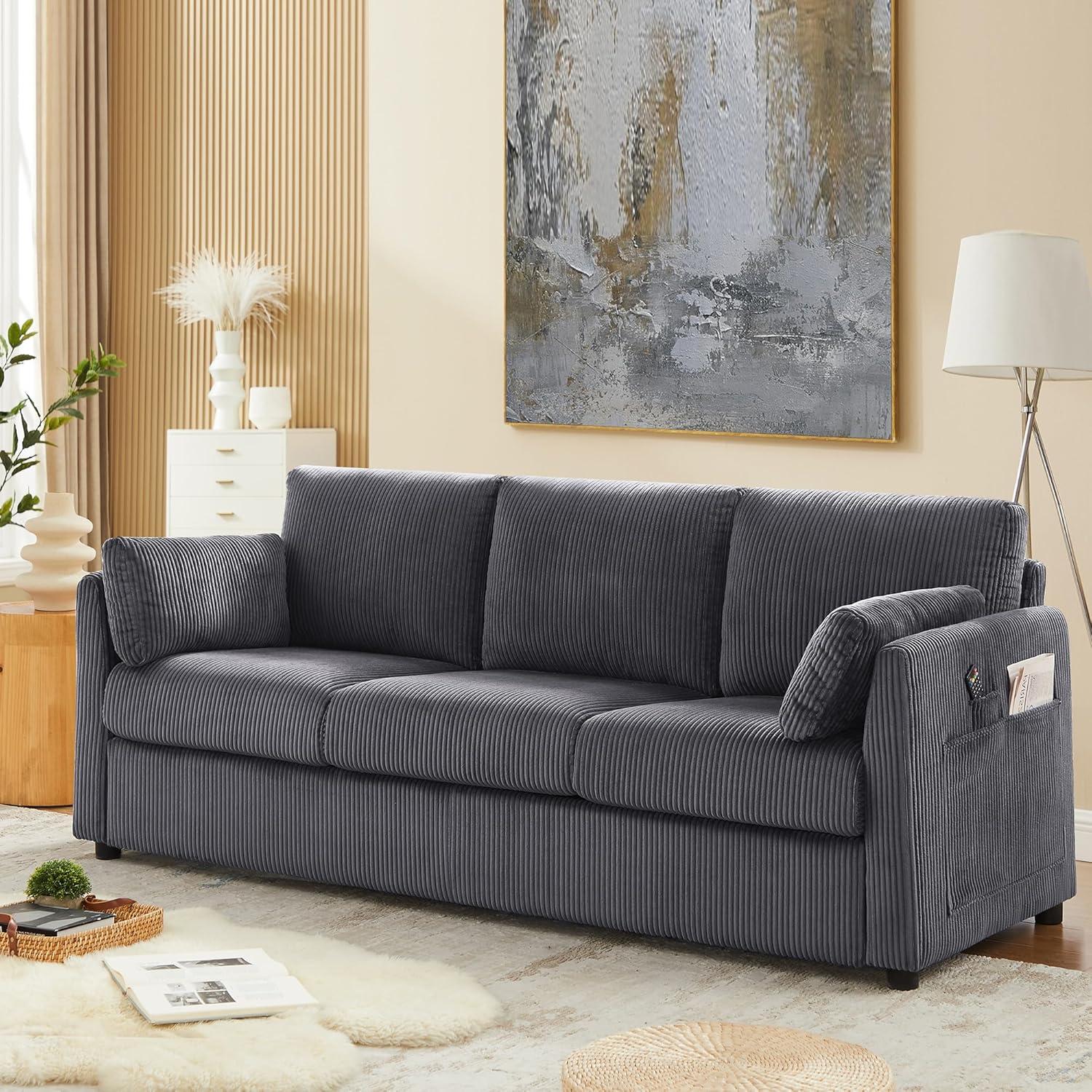 We found this three-seat couch to be an excellent blend of comfort and modern design, perfect for apartments and small living spaces. Upholstered in soft,durable corduroy fabric,it offers a cozy,breathable surface that works well throughout the seasons. The cushioning strikes a nice balance with medium firmness thanks to high-density foam filling,providing enough resilience to support long hours of sitting without feeling too stiff or saggy.Assembly was straightforward for us, taking around 20 minutes, and the detailed manual made the process hassle-free-even assembling it solo was doable.