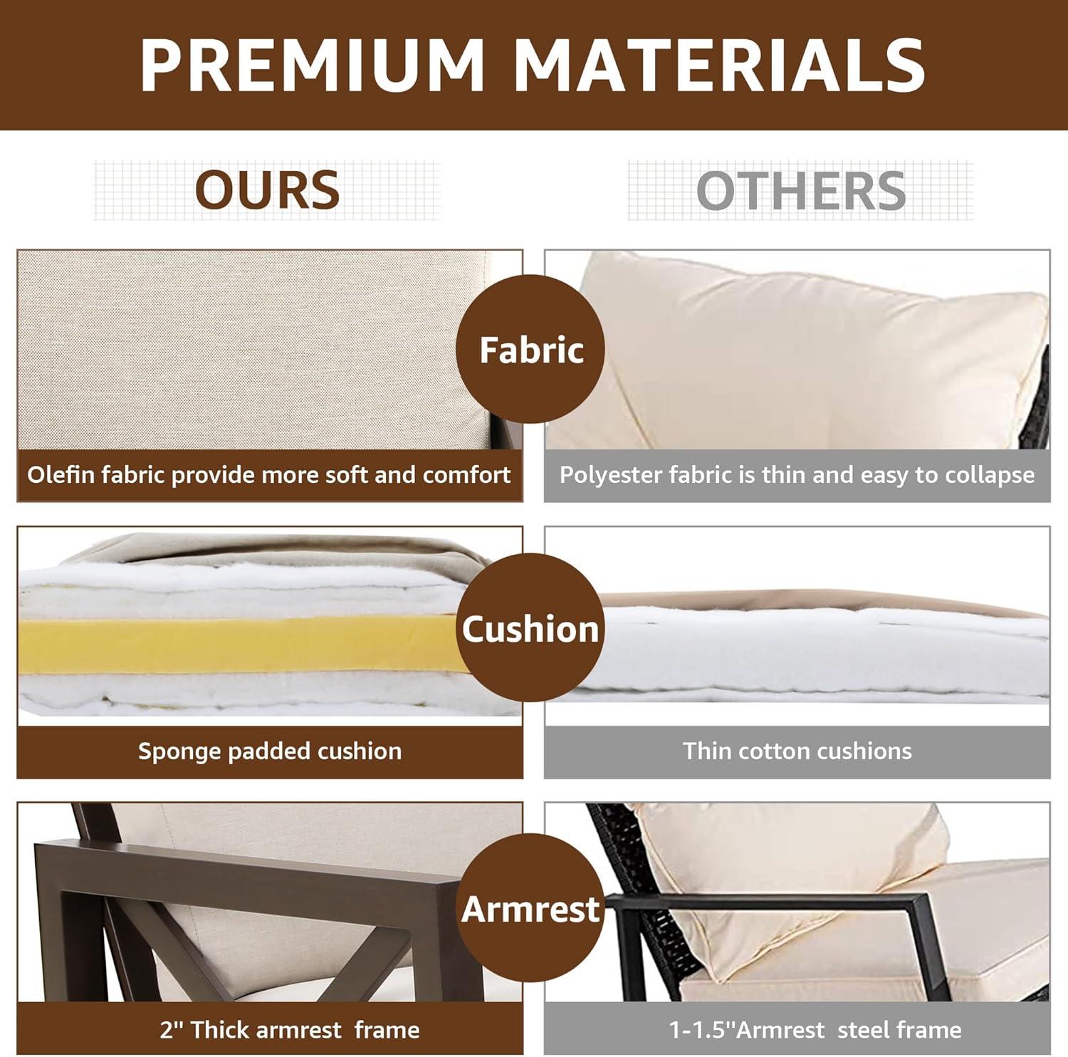 Beyond softness, durability is a standout feature. The cushions resist deformation and maintain their shape even after prolonged use, supported by a robust metal frame that handles up to 350 lbs per seat. The careful craftsmanship, from rust-proof coating to sturdy piping, ensures the cushions perform well in diverse weather conditions without compromising their structural integrity or comfort. Here’s a quick overview of key cushion features:
