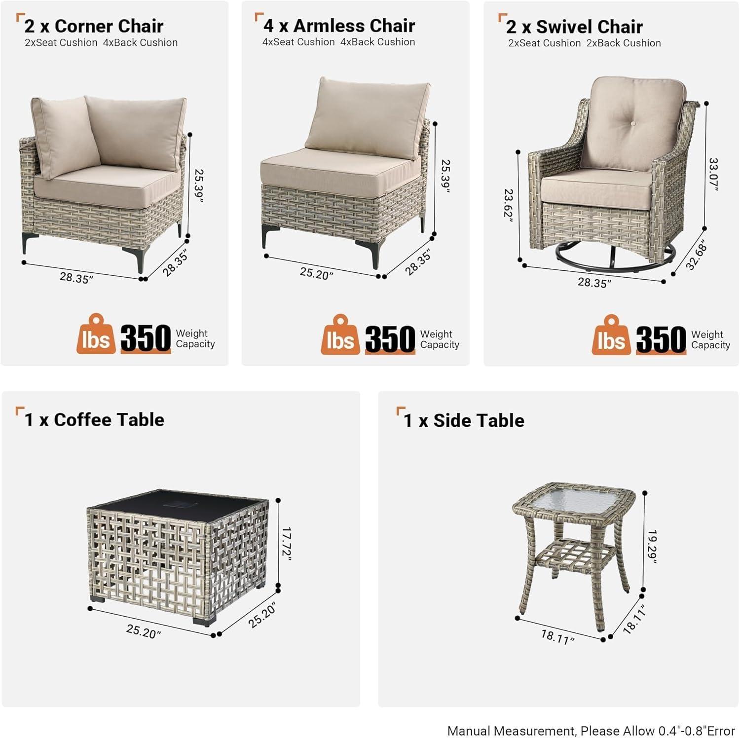 The swivel rocking chairs in this set redefine outdoor comfort with their smooth, gliding motion paired with ergonomic support. Crafted with woven rattan wicker, they blend seamlessly with the rest of the modular sectional and single chairs, creating a cohesive, stylish ensemble. The cushioned seating softly cradles us, making these chairs perfect for long conversations or moments of quiet relaxation.Whether placed by the poolside or on the porch, their gentle rocking combined with 360-degree swivel functionality offers unparalleled versatility and ease of movement.