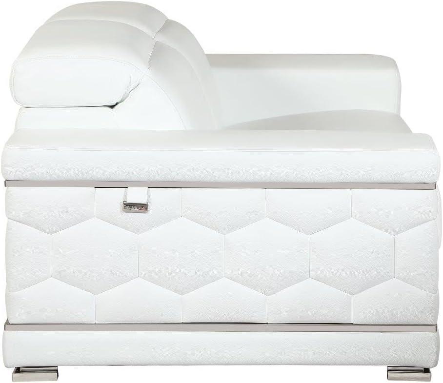 This collection offers a stunning blend of contemporary elegance and comfort, perfectly designed to elevate any living space.Each piece is upholstered in top grain italian leather that exudes luxury,complemented by sleek chrome trim and distinctive hexagon-shaped accents. The color white adds a bright, modern touch while maintaining versatility for various décor styles. designed with multi-position adjustable headrests, the set prioritizes both style and personalized relaxation. Crafted from a sturdy wood frame with resilient solid woods and plywood, the furniture guarantees durability without compromising on aesthetic appeal.