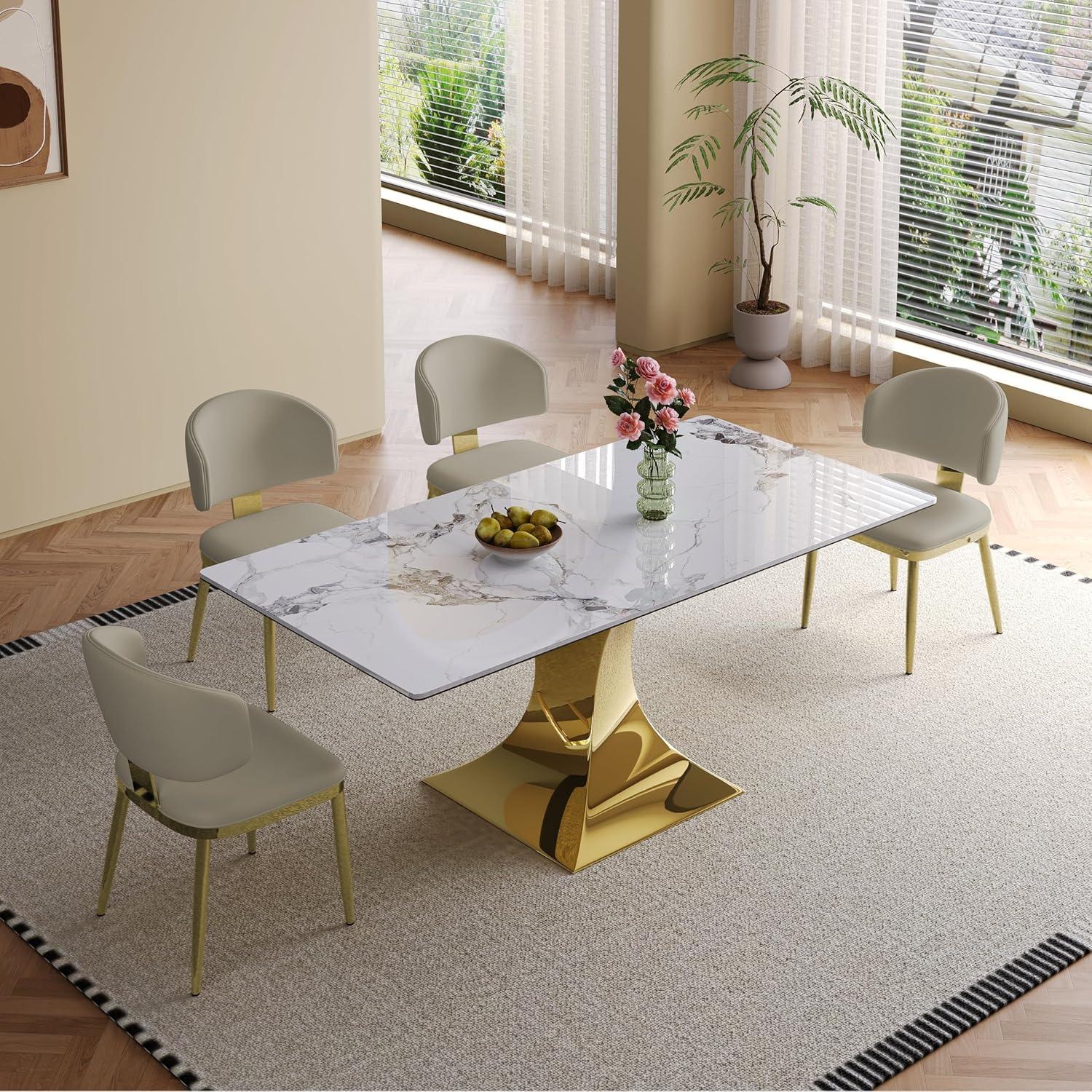 Our experience with this dining set has been impressively positive, especially when considering the balance between aesthetic sophistication and practical value. The sintered stone tabletop, with its luxurious rock pattern and exceptional durability, adds a refined touch to our dining space while resisting scratches, heat, and moisture with ease. the sleek hourglass base not only supports the table structurally but also doubles as an architectural statement, perfectly complementing the elegant white and gold finish. Coupled with the ergonomic leather chairs upholstered in grey, the set creates a harmonious blend of comfort and contemporary style that elevates any room it’s placed in.