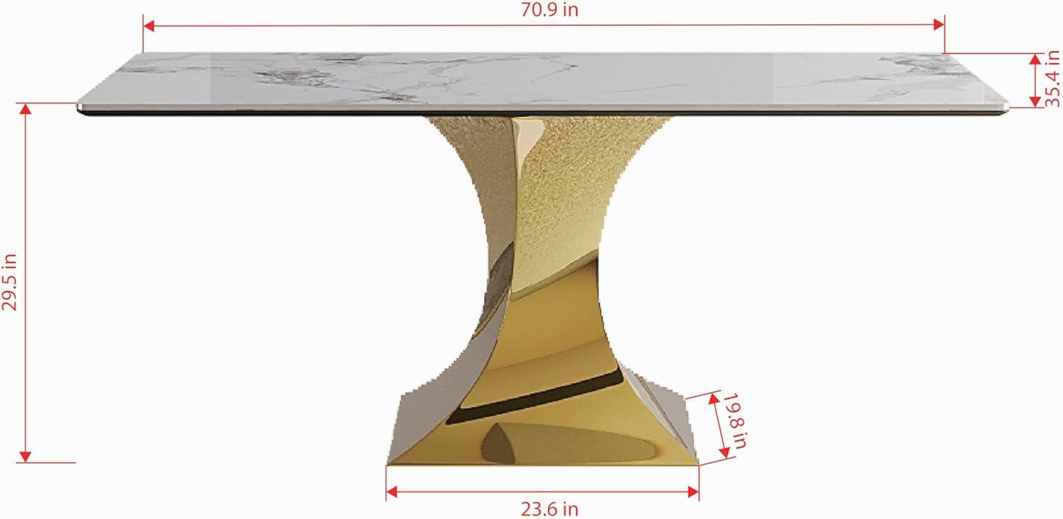 | Striking Modern Design: The hourglass-shaped stainless steel base paired with the white-gold marble-pattern top creates a bold, architectural centerpiece that elevates any dining room atmosphere. | Color Specificity: The white-gold tabletop with grey chairs might limit versatility with certain interior color palettes if your décor leans towards warmer or darker tones. |