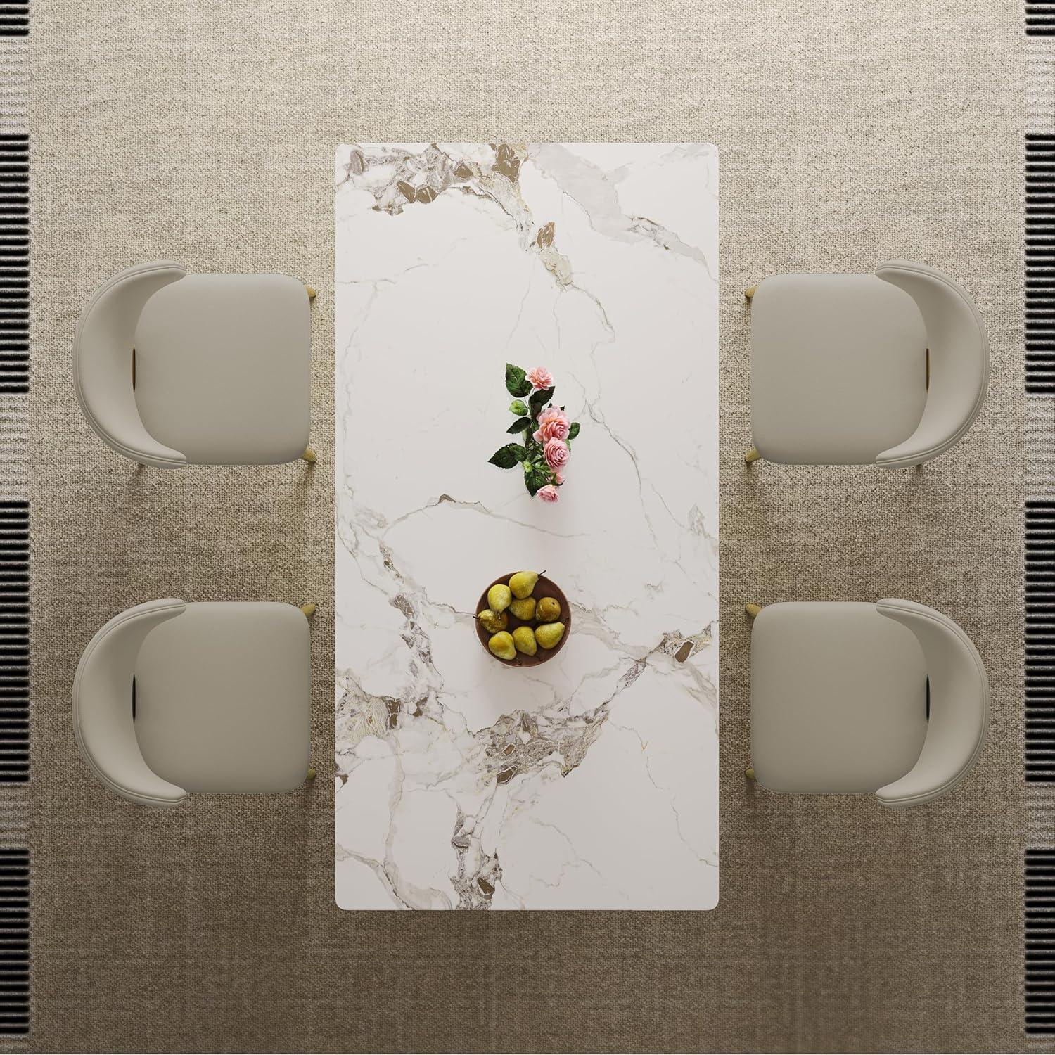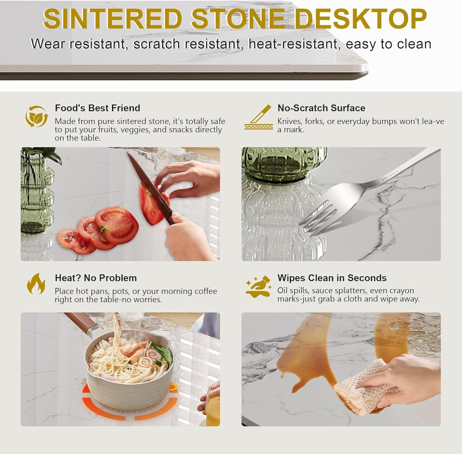 Our experience with this dining set has been marked by a harmonious blend of style, durability, and comfort. The standout feature is unquestionably the sintered stone tabletop, which exudes a smooth, glossy marble-like finish in white-gold that instantly elevates the aesthetic of any room. beyond its beauty, the surface’s extraordinary hardness rating ensures it resists scratches and heat damage, making it ideal for busy households or casual dinners without the constant worry of wear and tear. we also appreciate the thoughtfully rounded edges, which add a subtle softness while enhancing safety around children and pets.
