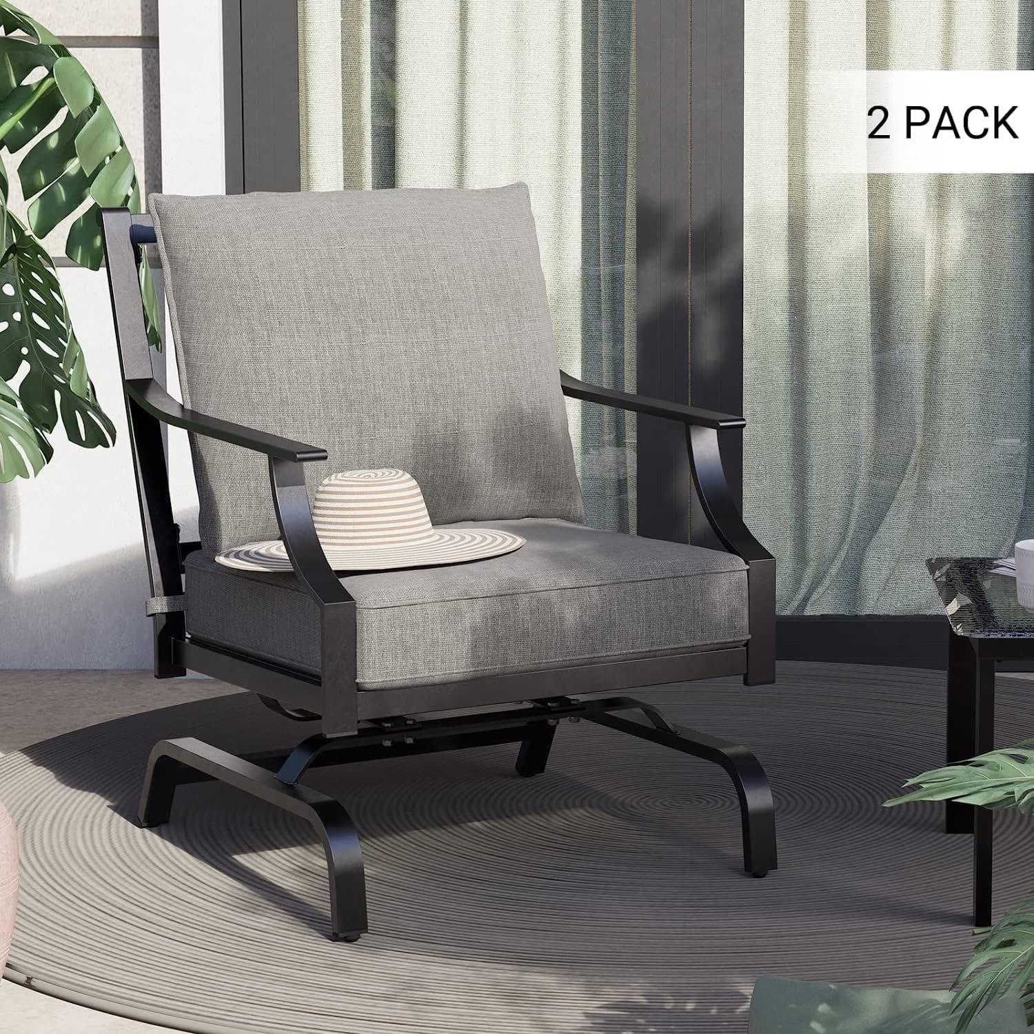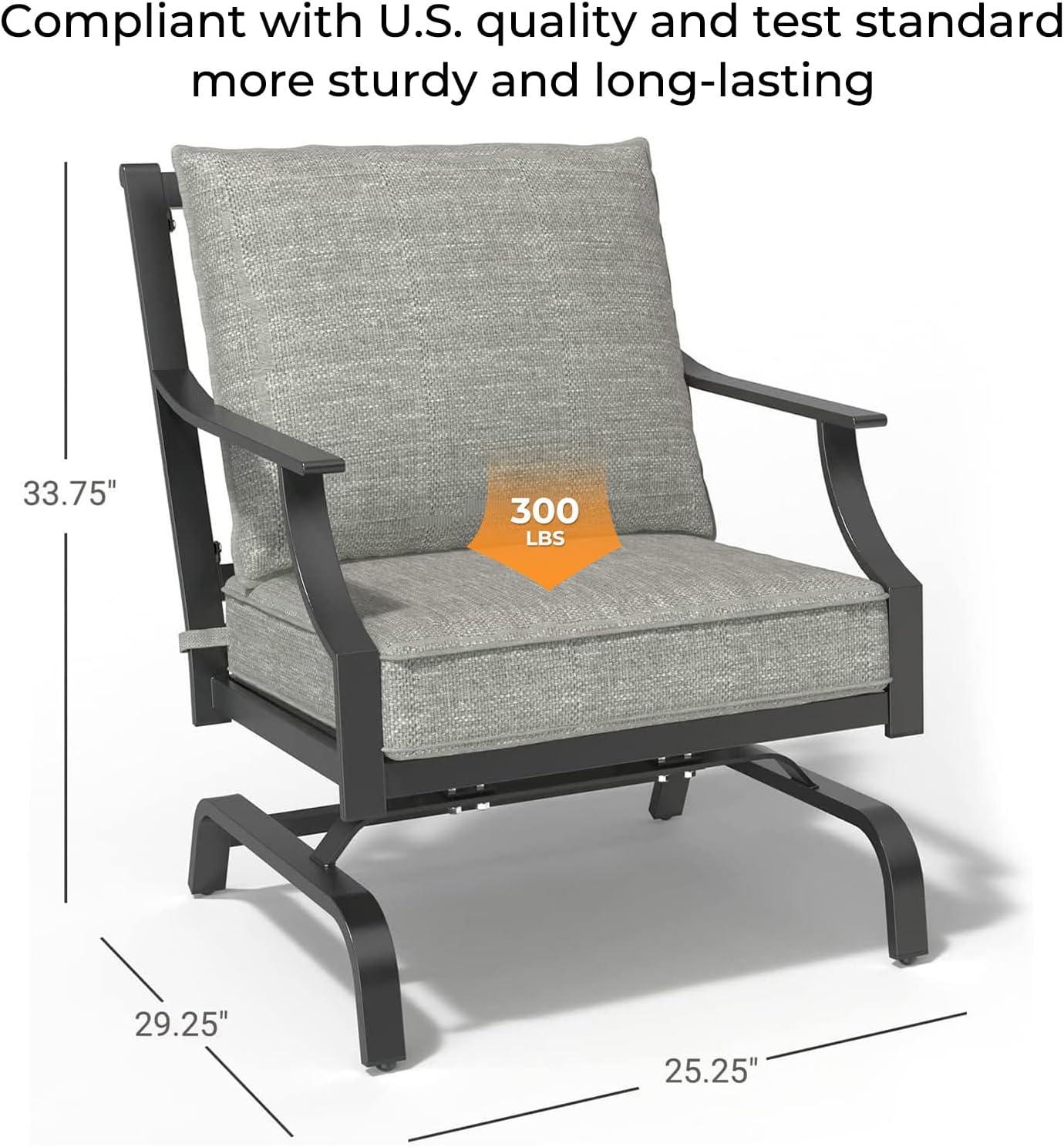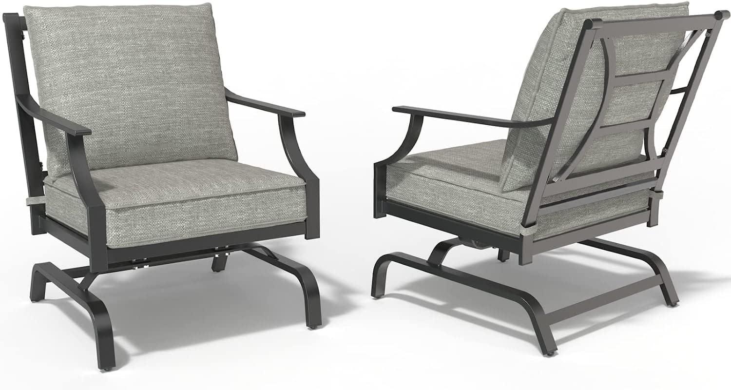 Spending long hours chatting outdoors has never felt more relaxing.the subtle 5-10° rocking motion of these chairs provides a gentle, soothing sway that keeps us comfortable without causing fatigue.Thanks to the elastic steel base design, each seat offers just the right amount of give to relieve pressure points while seated.The plush grey cushions add an extra layer of softness that supports our back and hips evenly, making it easy to stay engaged in conversations without feeling restless or uncomfortable.