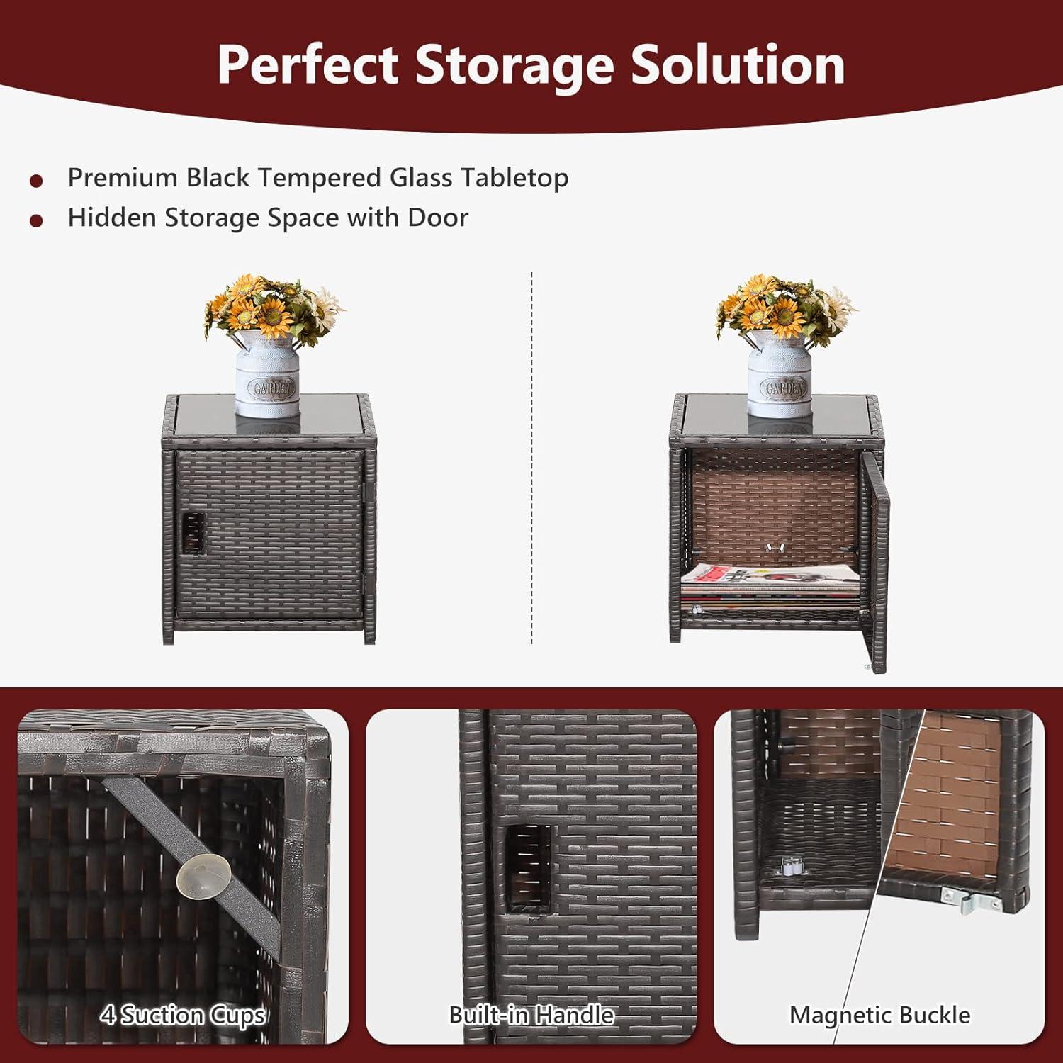 The coffee table included in this patio set perfectly balances style and practicality. Featuring a tempered glass tabletop secured by suction cups, it offers a smooth and stable surface ideal for holding your drinks, snacks, or decorative items during those leisurely outdoor moments. What sets this table apart is its cleverly designed hidden storage space underneath the top. The discreet door opens to reveal ample room to tuck away essentials like cushions, magazines, or garden accessories, keeping your patio clutter-free and organized. This thoughtful integration ensures that everything you need for relaxation is within arm’s reach yet neatly stowed away.