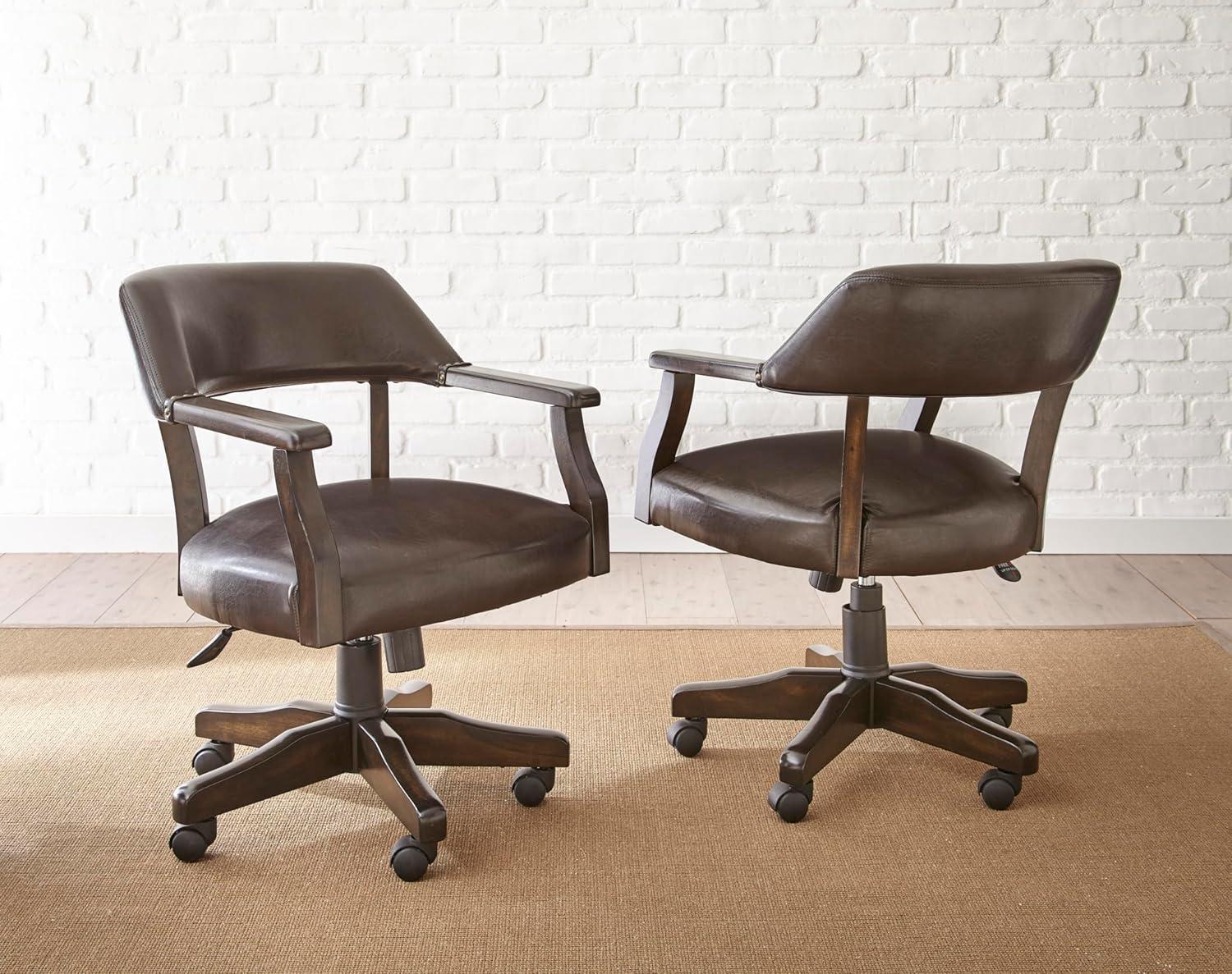 From the moment we settled into this captain’s chair, it was clear that comfort was a priority in its design. the ergonomic shape, combined with smooth vinyl upholstery, offers a plush seating experience perfect for extended work sessions.The rich dark brown finish adds a touch of sophistication to any office space, while the solid wood base conveys lasting durability. Practical features like adjustable height and tilt control allow us to personalize the chair to our comfort needs, and the swivel mechanism coupled with smooth-rolling wheels provides excellent mobility throughout the workspace.