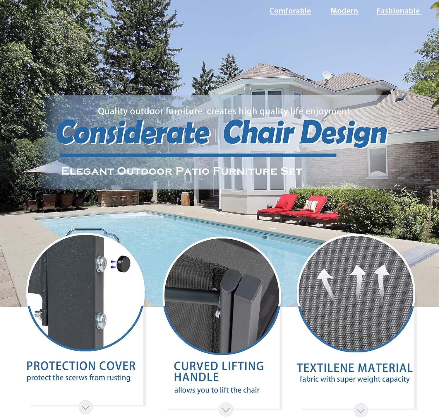 • Comfort-focused – textilene fabric sling seats for breathability