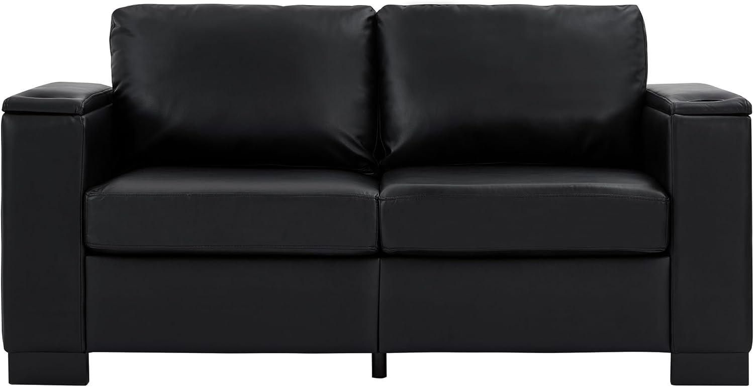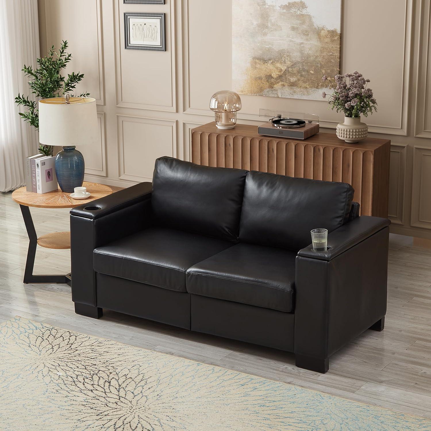After spending considerable time with this modern loveseat, we can confidently say it excels at balancing style and practicality. Its durable PU leather upholstery not only gives it a sleek, contemporary appearance but also makes cleaning effortless-just a quick wipe keeps it looking fresh.The spacious 67.7-inch width comfortably accommodates two people without feeling cramped, perfect for small living areas or offices. What truly sets this piece apart are the thoughtful features like the built-in cup holders and the hidden storage compartment beneath the seat, which help keep your living space organized and your favorite beverages within reach. Plus, the sturdy square arm design adds a modern touch while providing solid support for everyday use.