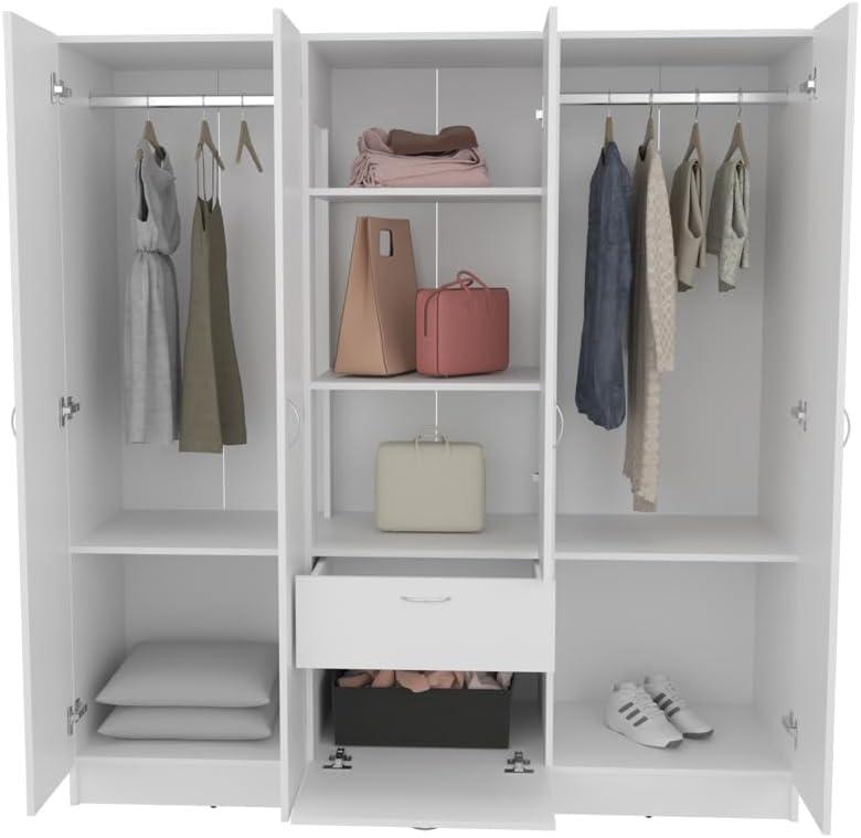 | Right Doors | Deep shelves + hanging rod | Shirts, pants, linens |