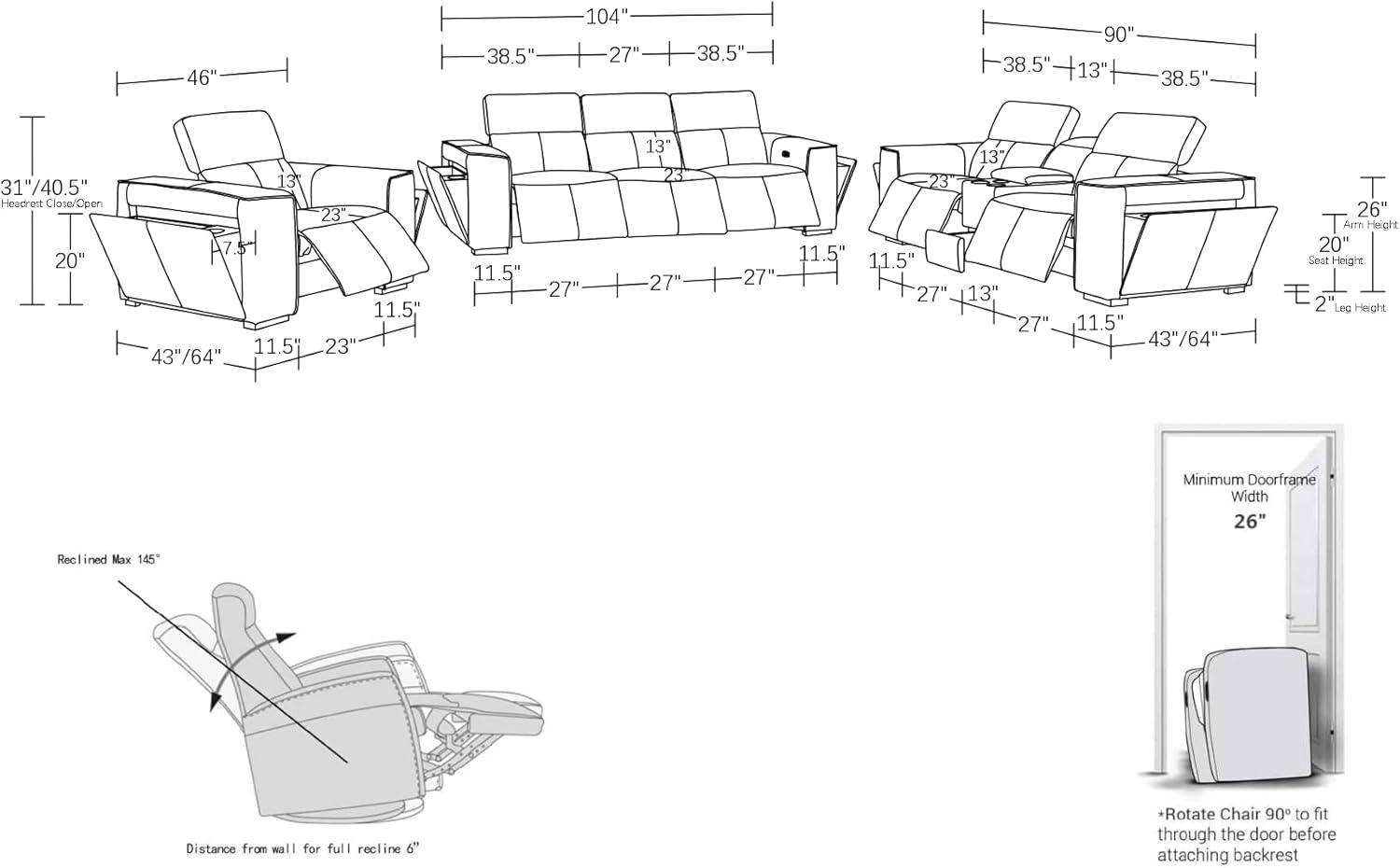 | Sofa | 104″ x 43″ x 31″ | 3 recliners, adjustable headrests |