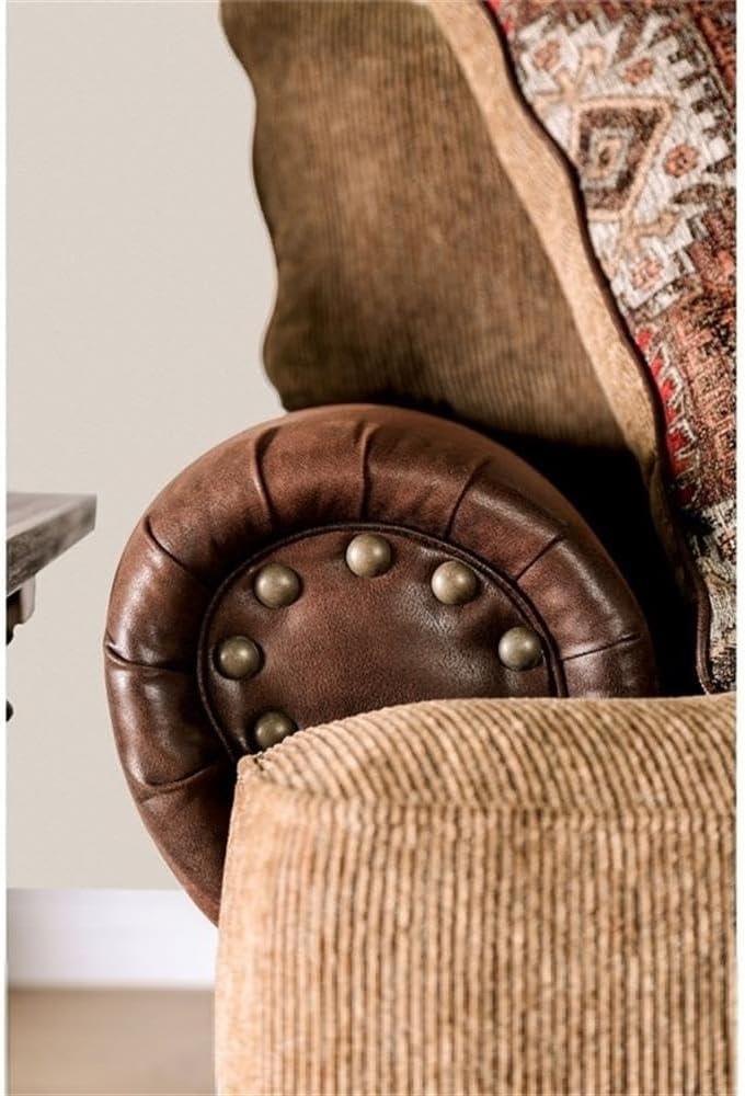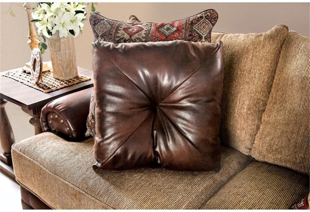 Blending traditional charm with rustic warmth, this set offers a unique style that immediately draws the eye. The rich brown chenille upholstery combines softness and durability, perfectly complemented by faux leather accents that enhance the tactile experience. Rolled arms framed by brass nailhead trim add a touch of artisan craftsmanship, making the design not only elegant but also full of character. Loose back pillows and included accent cushions provide a casual, inviting look that balances comfort with sophistication.