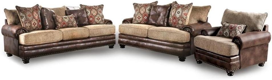 This set beautifully blends traditional charm with rustic flair, featuring a elegant mix of soft chenille and faux leather upholstery.Its rich brown finish and carefully crafted details-including rolled arms and brass nailhead trims-bring a warm,artisan appeal to any living space. The loose back cushions paired with plush accent pillows enhance both comfort and style, making this trio an inviting centerpiece for relaxation and social gatherings.