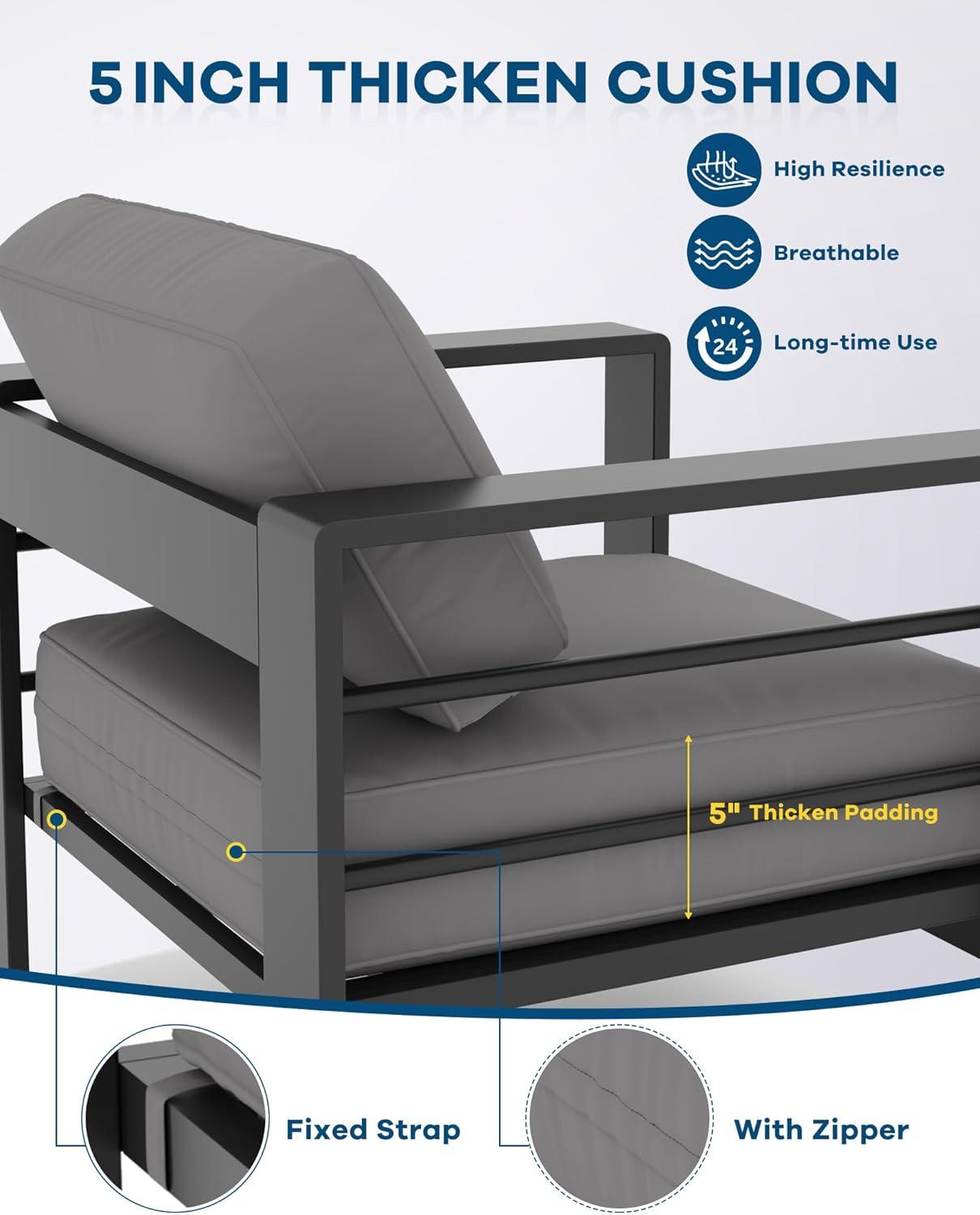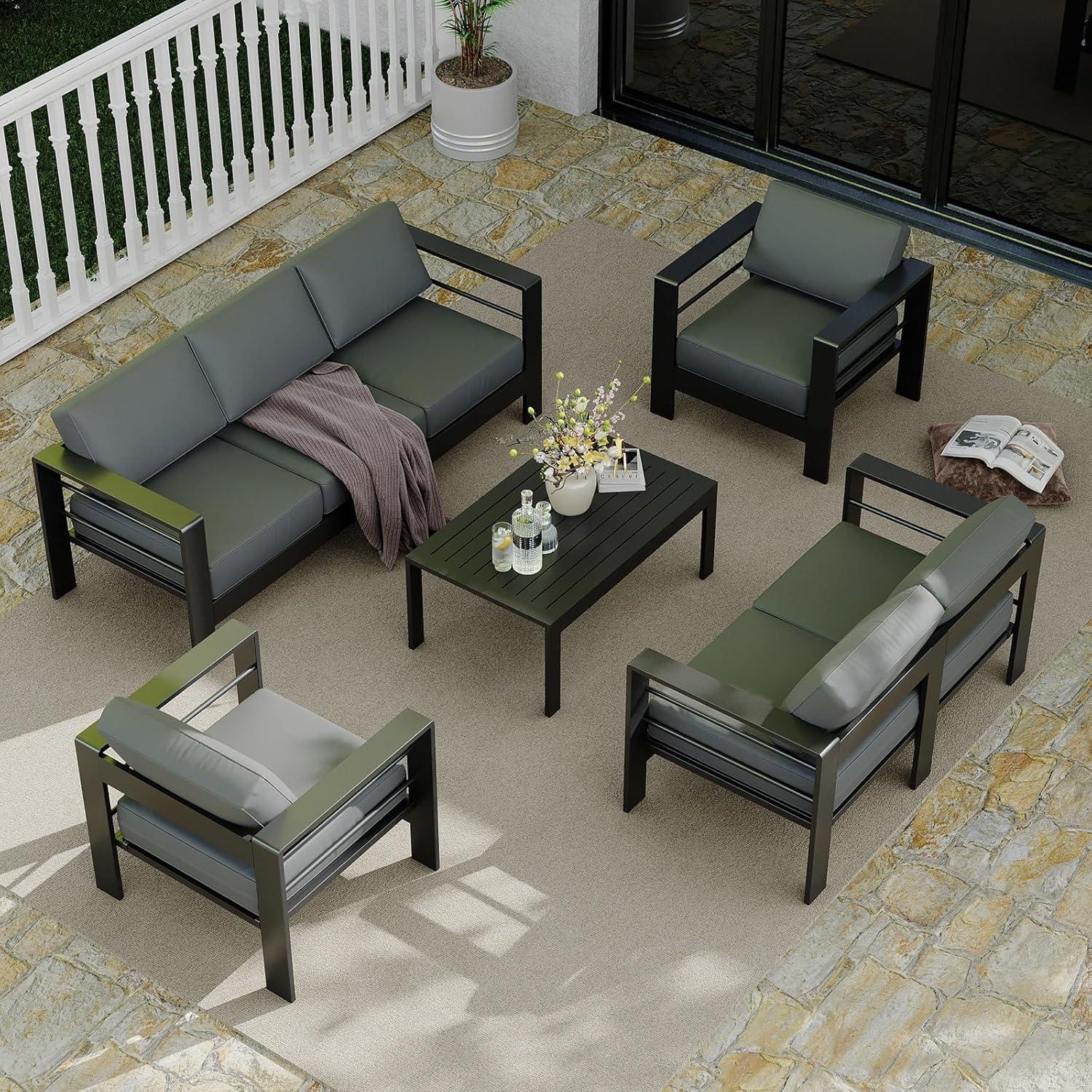 We appreciate the sleek, modern aesthetic that this furniture set brings to any outdoor space. Its dark grey finish provides a versatile, neutral base that blends effortlessly with various decor styles-from minimalist patios to lush garden settings. The thoughtful design includes a balanced mix of seating options: a three-seat sofa, loveseat, two single chairs, and a coffee table, enabling us to create both intimate corners and open lounging areas. The armrests, measuring a comfortable 4 inches, add a subtle sophistication without compromising function, while the 5-inch thick cushions invite relaxation and long conversations outdoors.