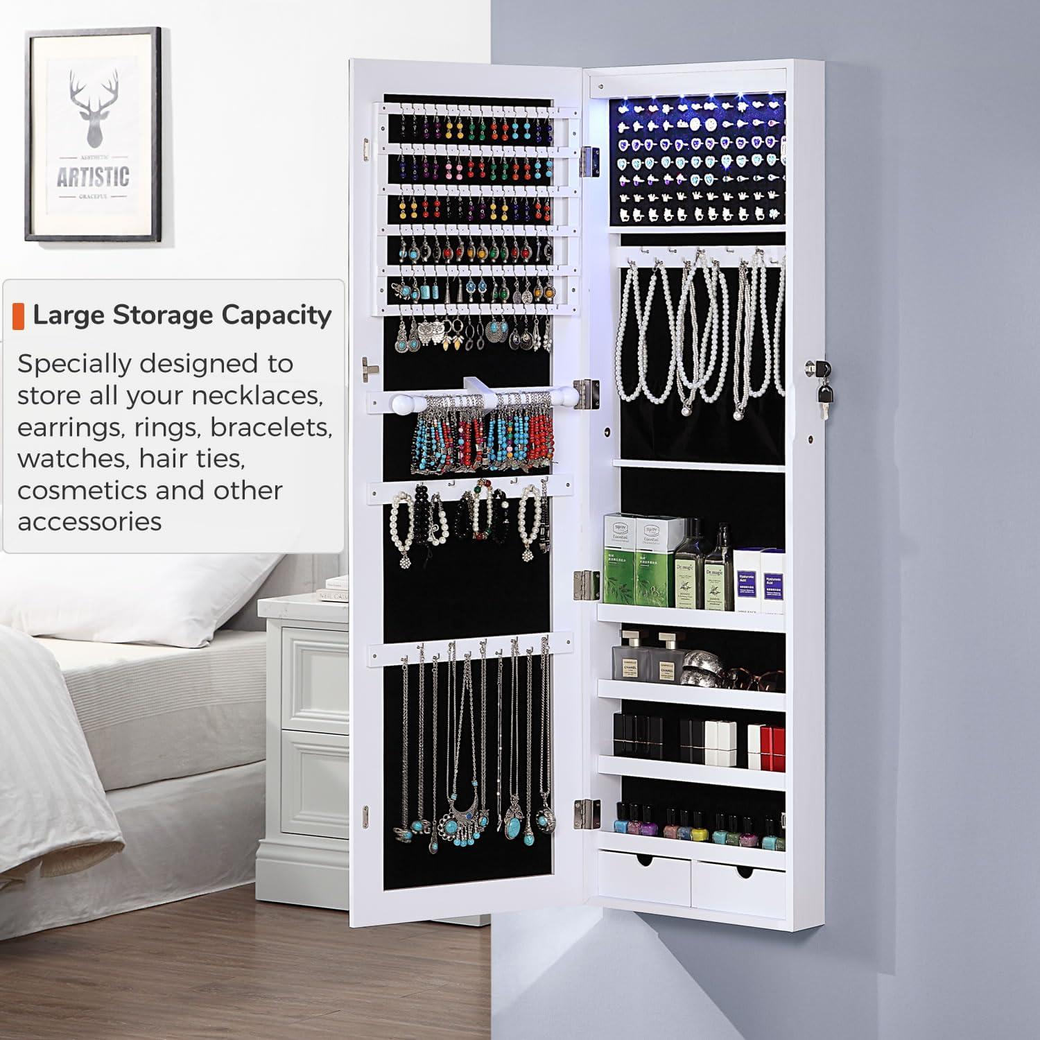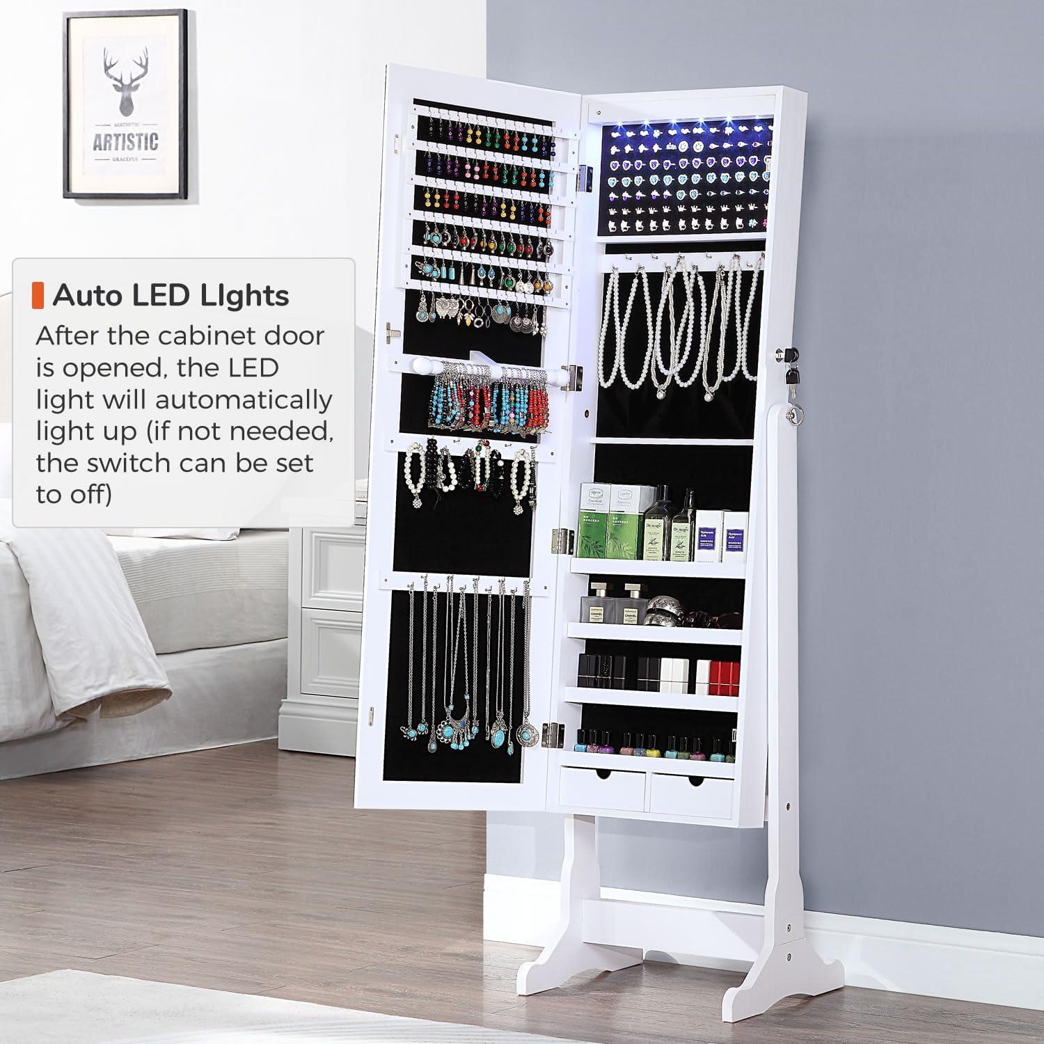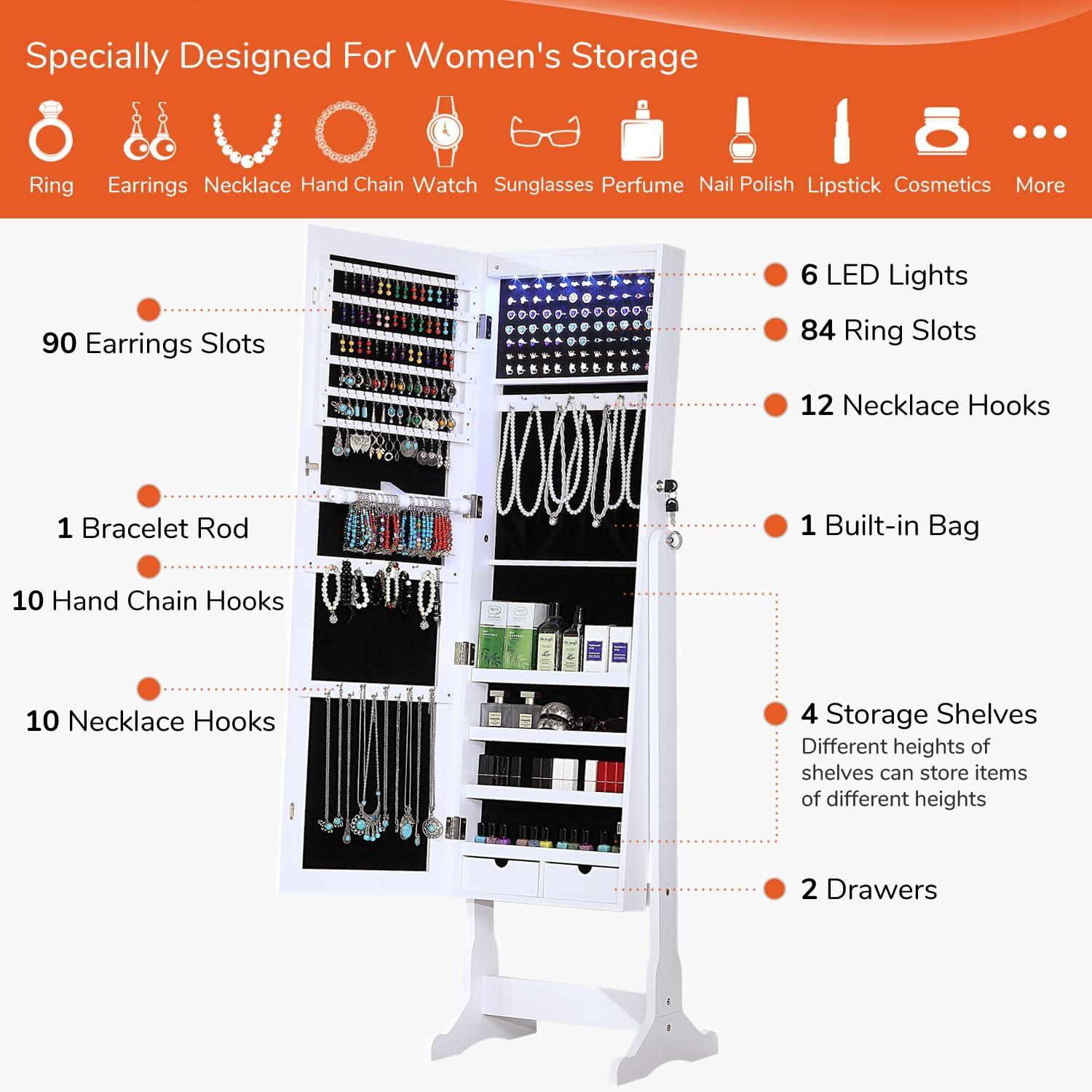 After using this jewelry cabinet, we appreciate its blend of style and functionality. The full-length frameless mirror is perfect for quick outfit checks, while the cozy LED lighting inside adds a touch of convenience when searching for pieces in low light. Its sturdy MDF construction and elegant white finish make it a visually appealing addition to any bedroom or dressing area.the ample storage options-including multiple hooks, ring slots, shelves, and drawers-allow for organized storage of a wide variety of jewelry and accessories. The lockable feature provides extra security,especially useful for households with children. Assembly is straightforward thanks to well-labeled parts and clear instructions, making the setup process hassle-free.