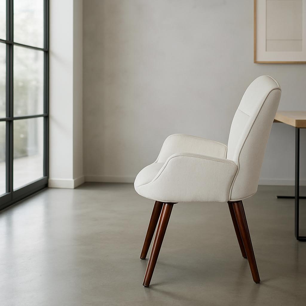We believe this chair strikes the perfect balance between vintage aesthetics and modern practicality. Upholstered in soft fabric suede that mimics real leather, it brings a touch of sophistication to any environment-whether it’s a home office, living room, or a compact apartment. Thanks to its plush cushions and ergonomic design, it supports us comfortably even during extended work sessions or relaxation times. The durable walnut legs not only provide solid stability but also add a warm, natural contrast to the beige upholstery, contributing to the chair’s overall timeless appeal.