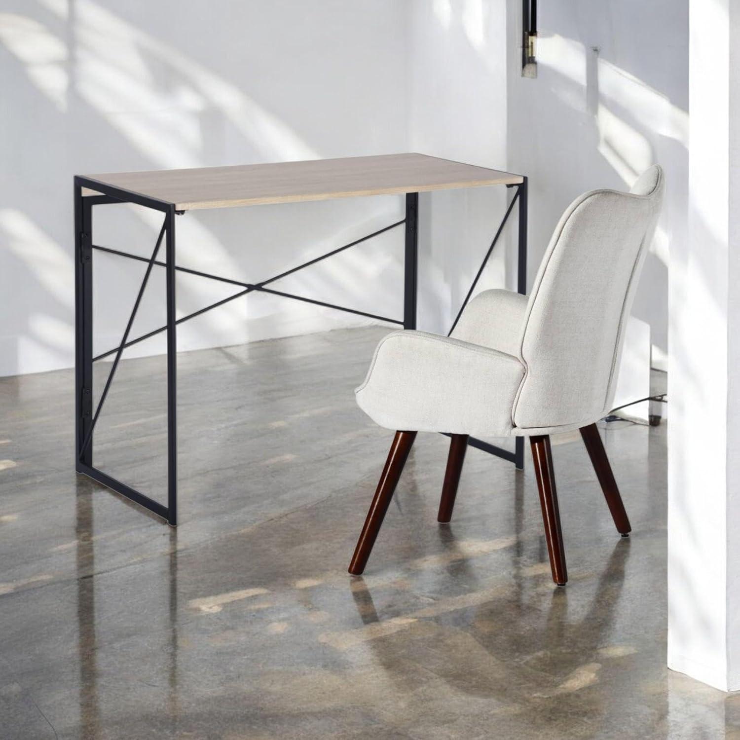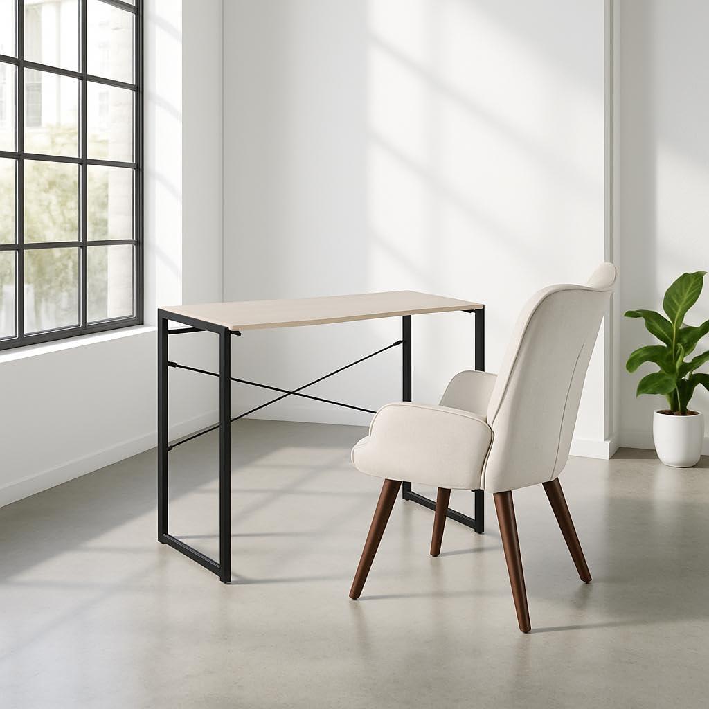 | home Office | wood desk, metal lamp, minimal wall art | Beige, dark brown, matte black |