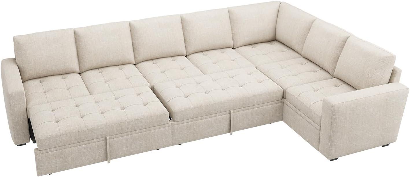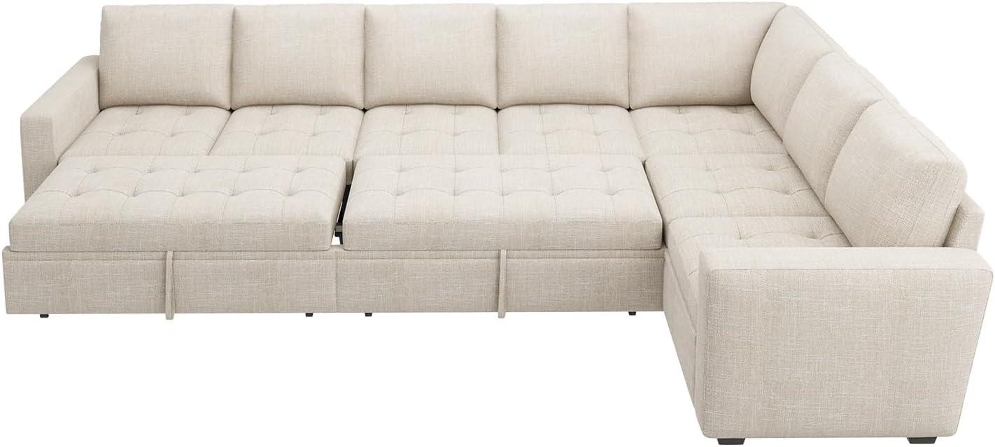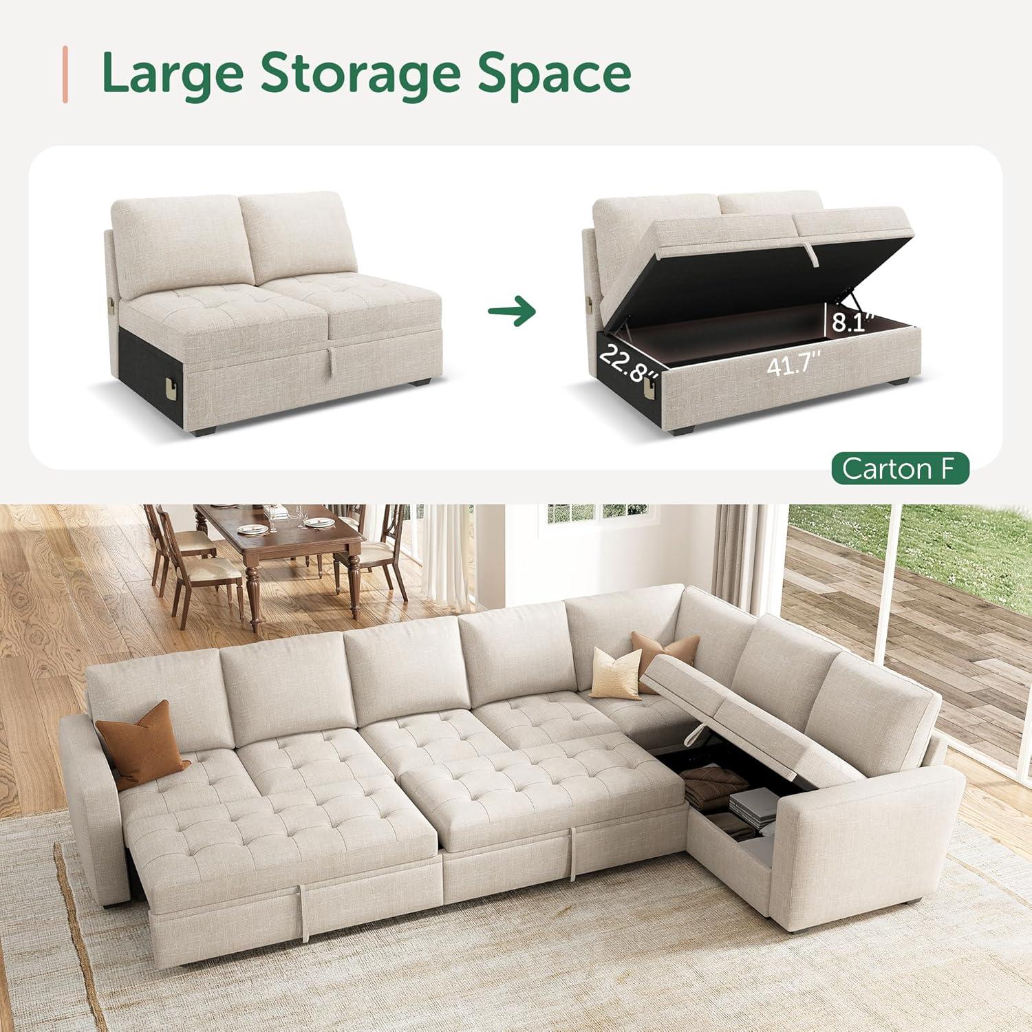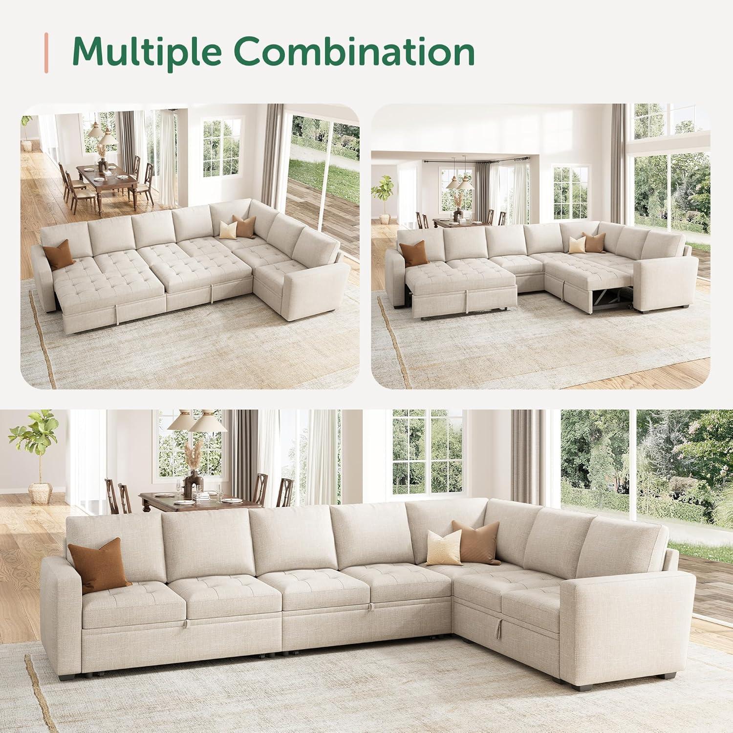 Combining versatility with modern comfort, this modular sectional sleeper sofa is built to adapt seamlessly to any living area. Its design prioritizes functionality without sacrificing style, featuring six interchangeable pieces, including single seats, loveseats, ottomans, and a convenient pull-out bed. The flexible configurations allow us to personalize the couch layout to perfectly fit our room dimensions and aesthetic preferences.The neutral beige upholstery enhances its timeless appeal, making it easy to blend into various interior styles while adding a cozy, inviting atmosphere.