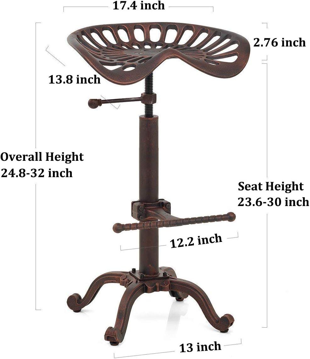 | 360° Swivel Seat: Smooth rotation adds versatility and convenience for casual seating. | Industrial Aesthetic: The rustic cast iron and tractor seat design may not suit more modern or minimalist décors. |