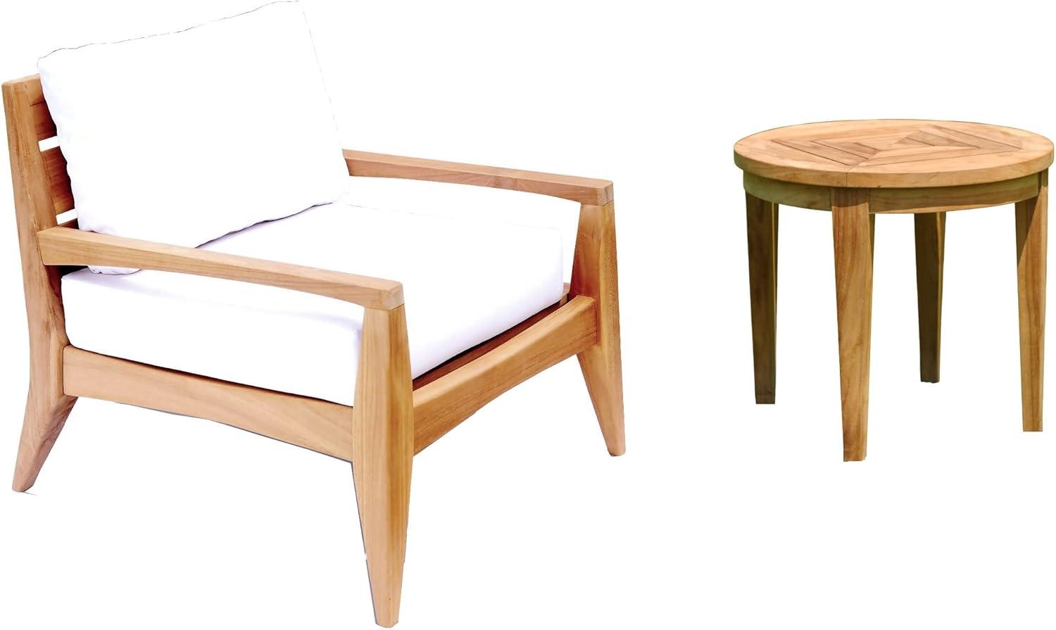 The round end table perfectly balances the spacious design of the two lounge chairs, creating a harmonious and inviting setup ideal for both indoor and outdoor living spaces. Crafted from the same high-quality Indonesian plantation teak, it shares the rich grain and durability, ensuring a cohesive aesthetic that complements the chairs without overpowering them. The table’s smooth, rounded silhouette contrasts elegantly with the solid, angular lines of the lounge chairs, adding a subtle softness to the overall design.