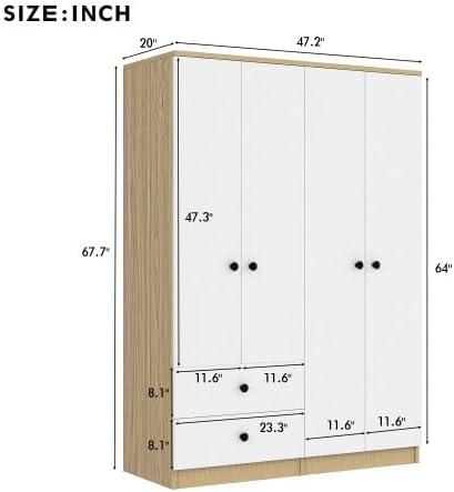 Regarding space considerations, this piece stands at 67.7″ tall and offers generous storage without occupying excessive floor area. It suits medium to larger bedrooms particularly well, thanks to its four doors, double rails, storage compartment, and drawers that help keep belongings neatly organized and out of sight. For smaller rooms, it still works efficiently if positioned thoughtfully, complementing the layout without creating clutter or crowding.