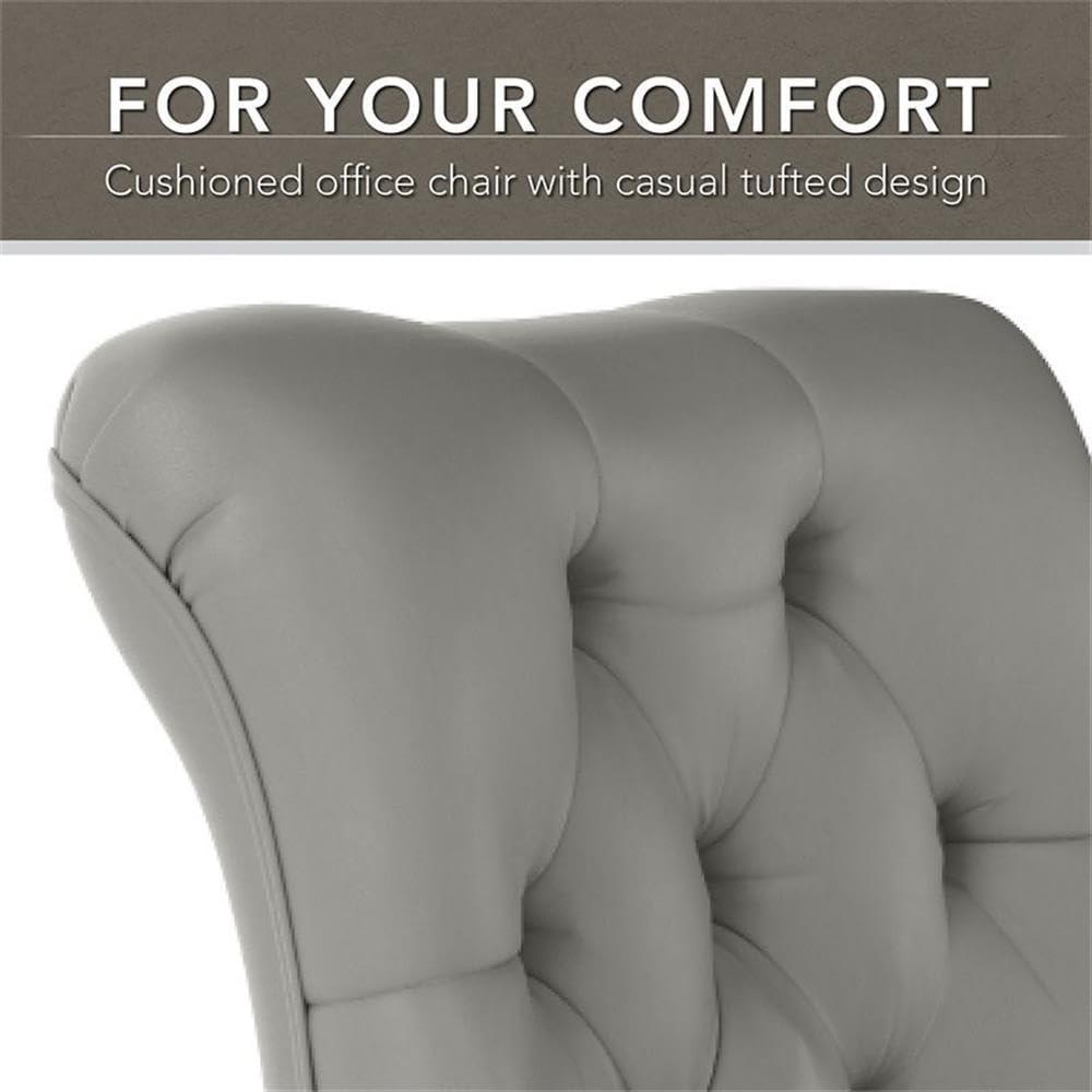 The chair’s sleek, armless silhouette immediately stood out to us, offering a modern yet casual appeal that fits seamlessly into any workspace. Upholstered in light gray faux leather, it strikes the perfect balance between stylish and subtle, enhancing rather than overpowering the room’s decor. This mid-back design incorporates gentle tufting that adds a touch of sophistication, while the espresso wood finish on the sturdy steel base adds warmth and durability. The chair’s five dual-wheeled casters ensure smooth, 360-degree mobility, letting us glide effortlessly without leaving our desks-ideal for multitasking in tight spaces.