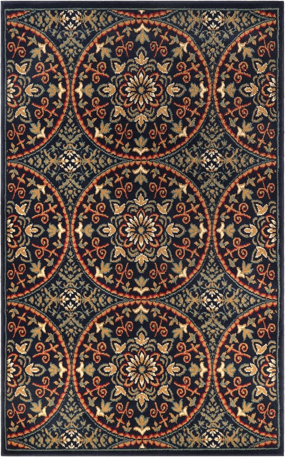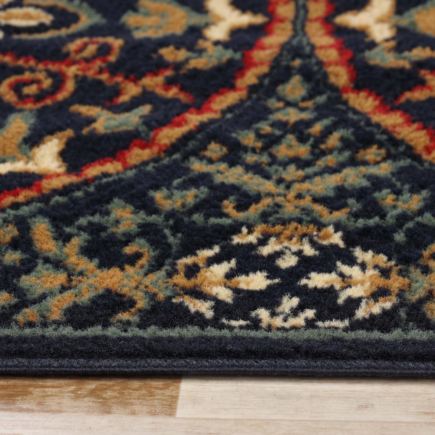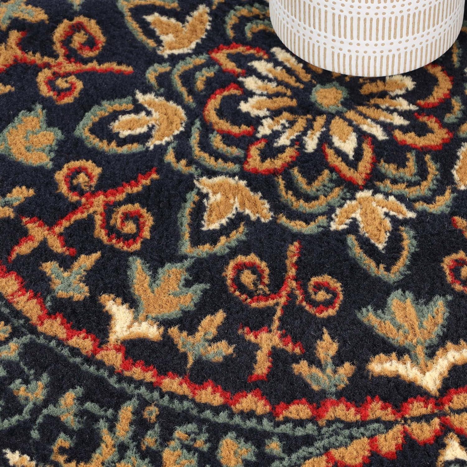 We’ve found that this rug brings a remarkable blend of style and functionality to any indoor space.The intricate medallion design, inspired by vintage Oriental patterns, adds both charm and a lively kaleidoscopic effect, thanks to the circular floral motifs set on a rich midnight blue background. Its plush 0.31-inch pile height, crafted from 100% high-quality polypropylene, offers a soft and cozy feel underfoot without sacrificing durability. This makes it ideal for bustling areas such as hallways, dining rooms, or offices where comfort and resilience are equally critically important. The sturdy jute backing not only maintains the rug’s shape but also ensures it stays securely in place throughout daily use.