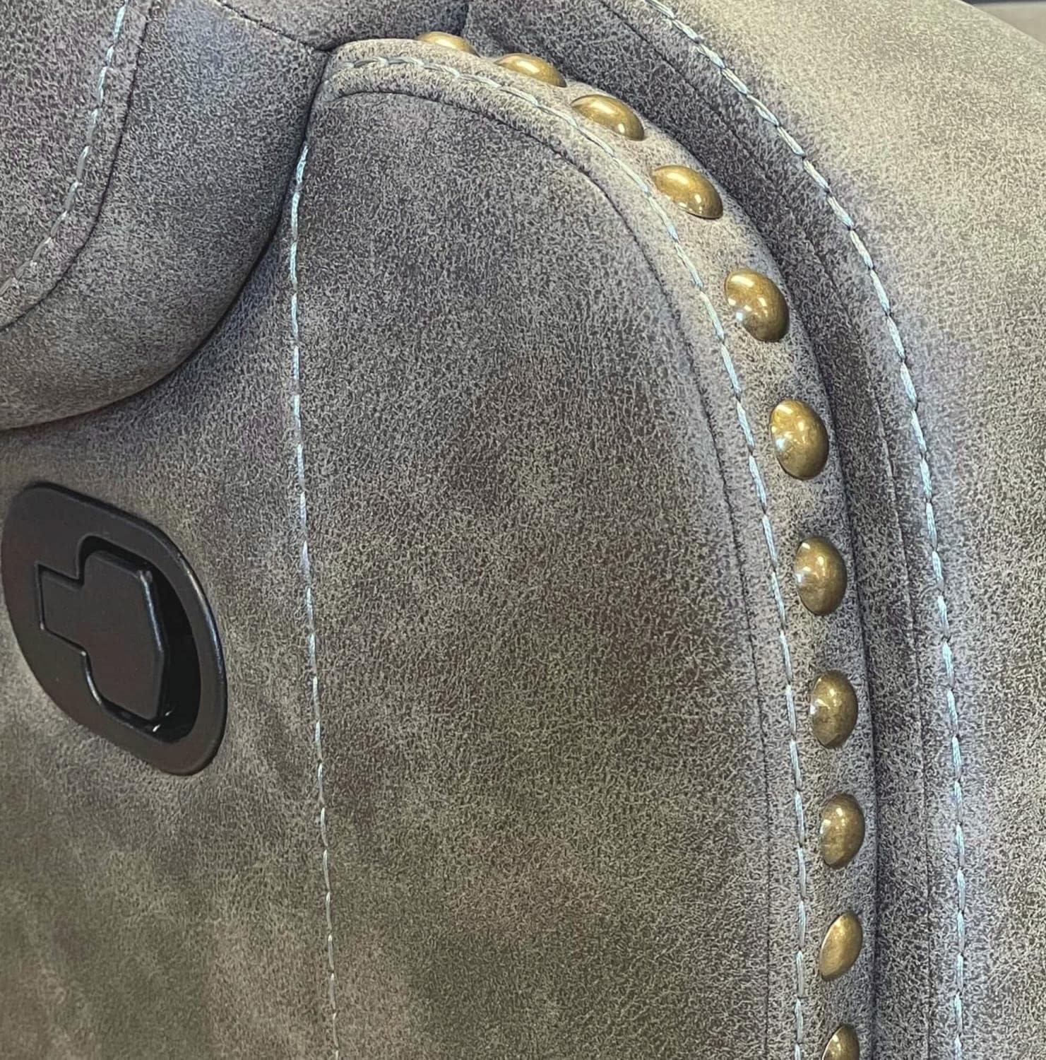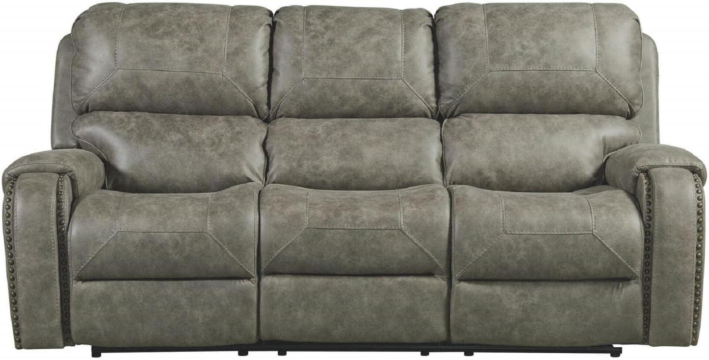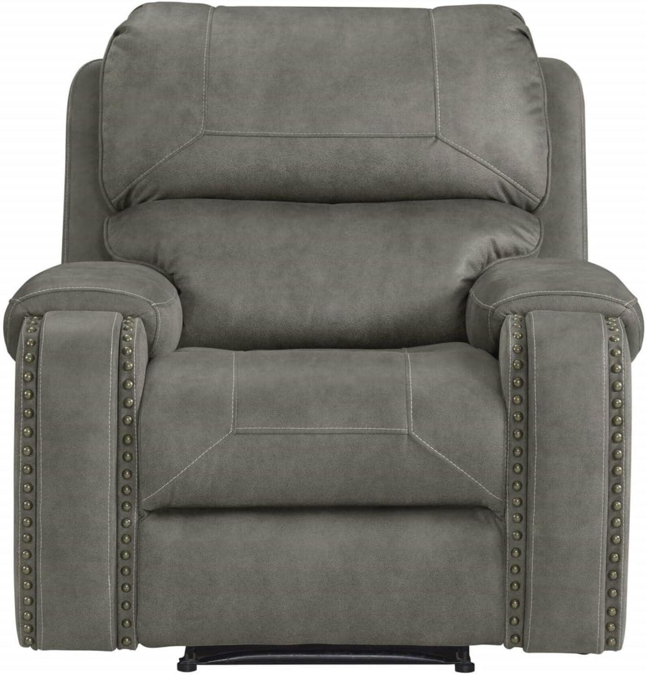 The set transforms our living room into a cozy retreat with its plush gray upholstery and elegant brass nailhead accents, adding a subtle yet sophisticated charm. The padded,contoured arms combined with overstuffed fiber-filled backs provide exceptional comfort and support,making every seating experience feel luxurious. Its rustic yet contemporary look blends effortlessly with our décor, enhancing the ambiance by inviting us to unwind-whether enjoying a quiet evening with a book or gathering with friends for game night. The seamless reclining mechanism and smooth footrest integration give a clean, cohesive look without sacrificing style or functionality.